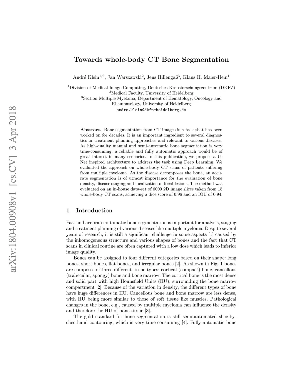 Bone segmentation from CT images is a task that has been worked on for decades. It is an important ingredient to several diagnostics or treatment planning approaches and relevant to various diseases. As high-quality manual and semi-automatic bone segmentation is very time-consuming, a reliable and fully automatic approach would be of great interest in many scenarios. In this publication, we propose a UNet inspired architecture to address the task using Deep Learning. We evaluated the approach on whole-body CT scans of patients suffering from multiple myeloma. As the disease decomposes the bone, an accurate segmentation is of utmost importance for the evaluation of bone density, disease staging and localization of focal lesions. The method was evaluated on an in-house data-set of 6000 2D image slices taken from 15 whole-body CT scans, achieving a dice score of 0.96 and an IOU of 0.94.
