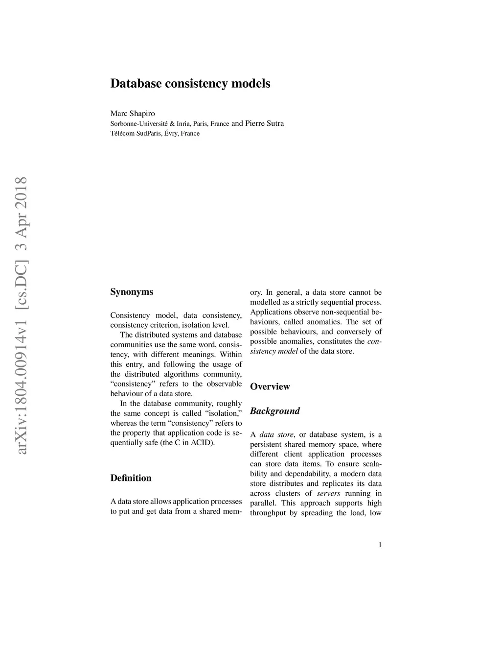 A data store allows application processes to put and get data from a shared memory. In general, a data store cannot be modelled as a strictly sequential process. Applications observe non-sequential behaviours, called anomalies. The set of pos- sible behaviours, and conversely of possible anomalies, constitutes the consistency model of the data store.