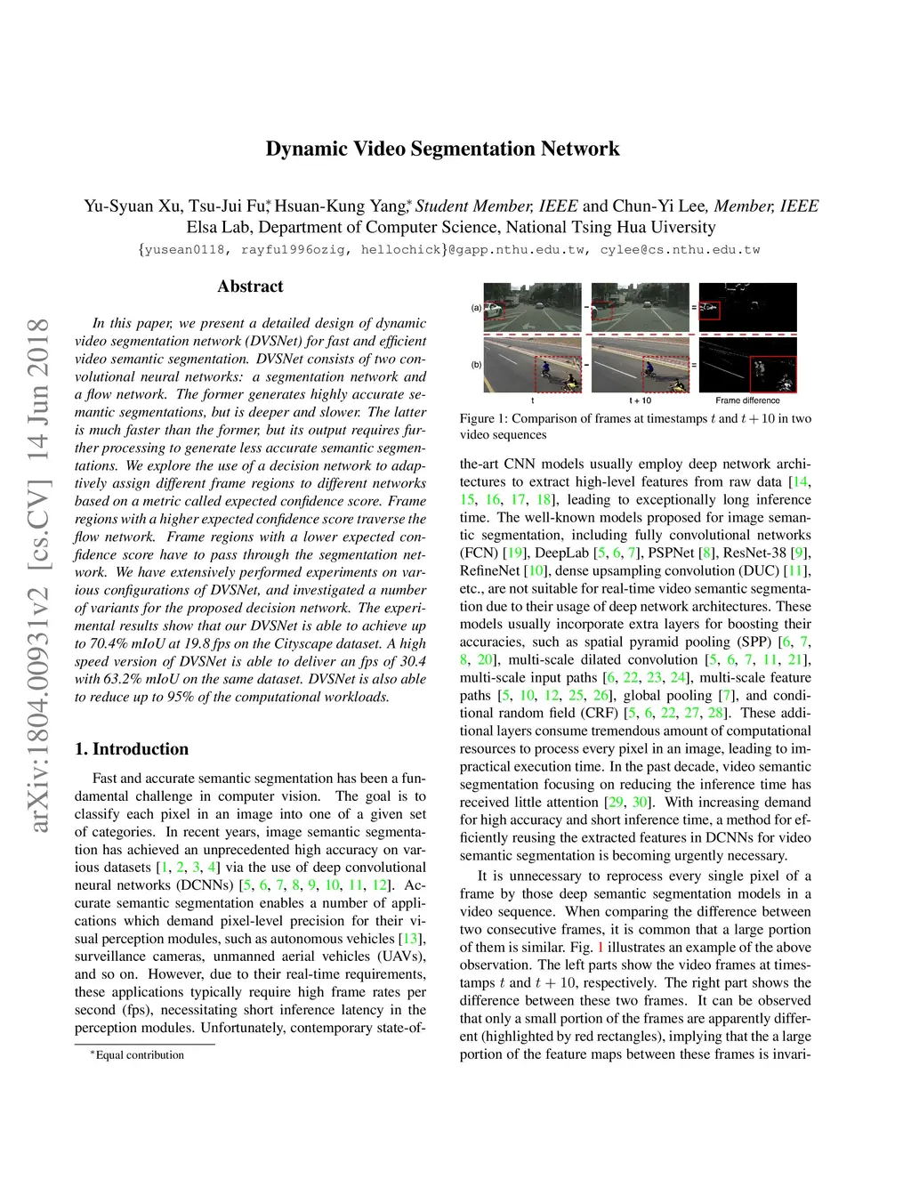 In this paper, we present a detailed design of dynamic video segmentation network (DVSNet) for fast and efficient semantic video segmentation. DVSNet consists of two convolutional neural networks: a segmentation network and a flow network. The former generates highly accurate semantic segmentations, but is deeper and slower. The latter is much faster than the former, but its output requires further processing to generate less accurate semantic segmentations. We explore the use of a decision network to adaptively assign different frame regions to different networks based on a metric called expected confidence score. Frame regions with a higher expected confidence score traverse the flow network. Frame regions with a lower expected confidence score have to pass through the segmentation network. We have extensively performed experiments on various configurations of DVSNet, and investigated a number of variants for the proposed decision network. The experimental results show that our DVSNet is able to achieve up to 70.4% mIoU at 19.8 fps on the Cityscape dataset. A high speed version of DVSNet is able to deliver an fps of 30.4 with 63.2% mIoU on the same dataset. DVSNet is also able to reduce up to 95% of the computational workloads.