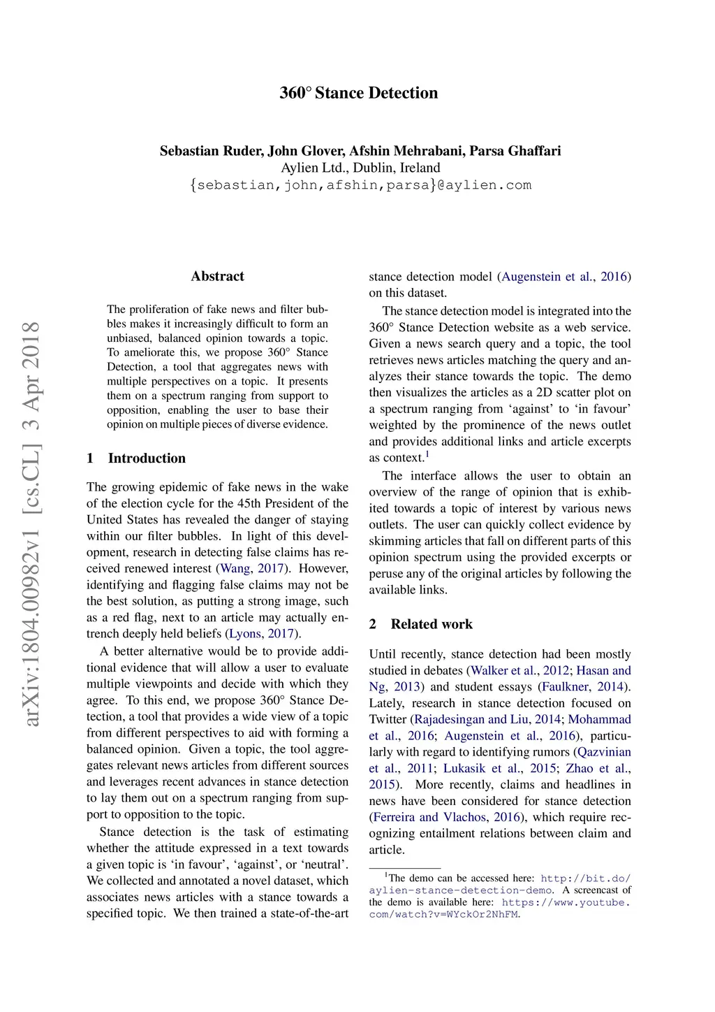 The proliferation of fake news and filter bubbles makes it increasingly difficult to form an unbiased, balanced opinion towards a topic. To ameliorate this, we propose 360{\deg} Stance Detection, a tool that aggregates news with multiple perspectives on a topic. It presents them on a spectrum ranging from support to opposition, enabling the user to base their opinion on multiple pieces of diverse evidence.