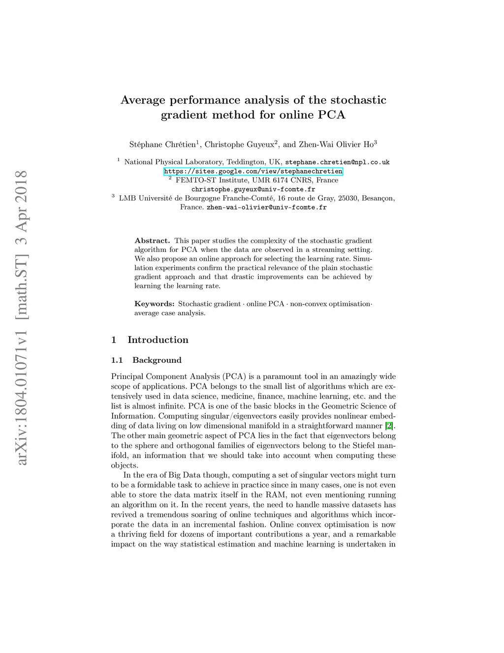 This paper studies the complexity of the stochastic gradient algorithm for PCA when the data are observed in a streaming setting. We also propose an online approach for selecting the learning rate. Simulation experiments confirm the practical relevance of the plain stochastic gradient approach and that drastic improvements can be achieved by learning the learning rate.