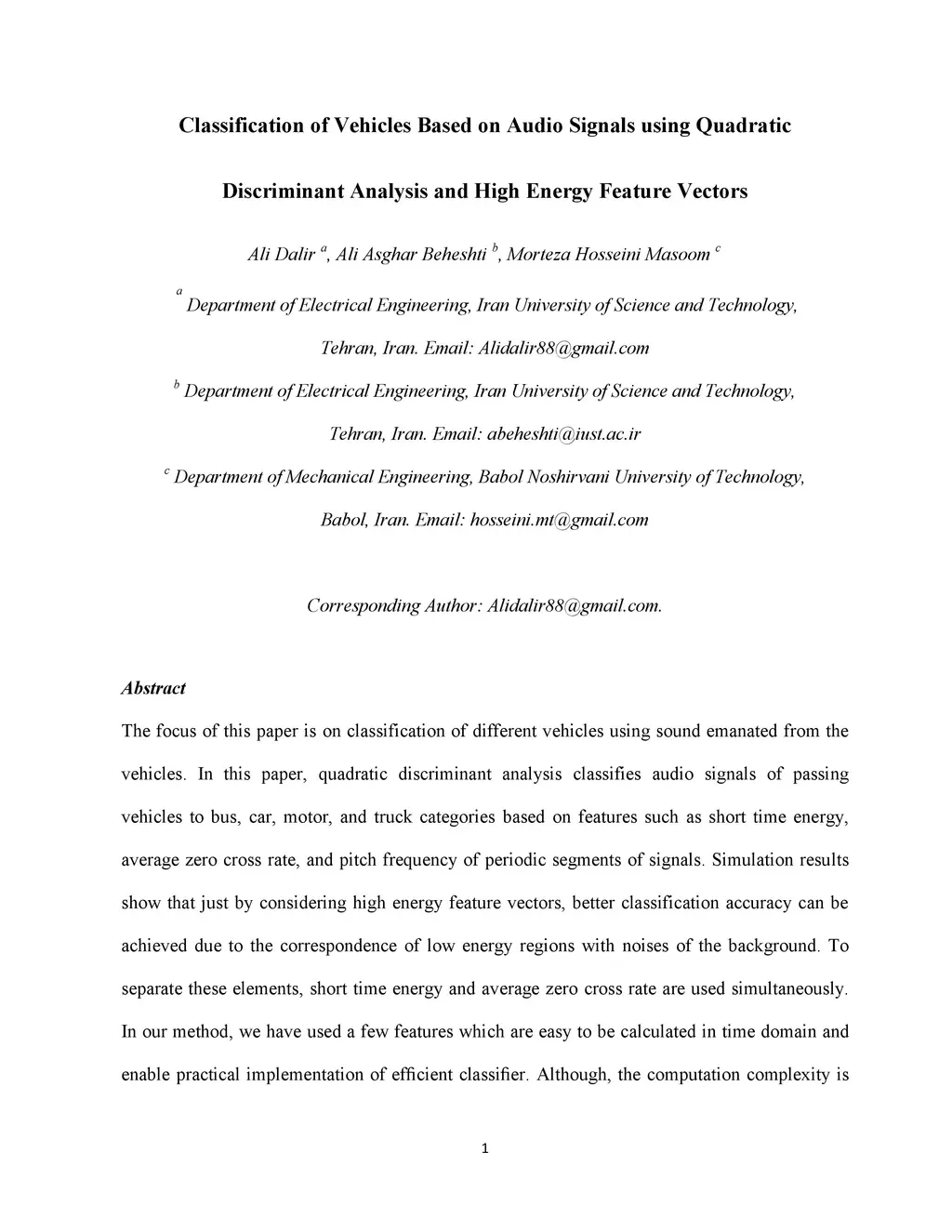 The focus of this paper is on classification of different vehicles using sound emanated from the vehicles. In this paper,quadratic discriminant analysis classifies audio signals of passing vehicles to bus, car, motor, and truck categories based on features such as short time energy, average zero cross rate, and pitch frequency of periodic segments of signals. Simulation results show that just by considering high energy feature vectors, better classification accuracy can be achieved due to the correspondence of low energy regions with noises of the background. To separate these elements, short time energy and average zero cross rate are used simultaneously.In our method,we have used a few features which are easy to be calculated in time domain and enable practical implementation of efficient classifier. Although, the computation complexity is low, the classification accuracy is comparable with other classification methods based on long feature vectors reported in literature for this problem.