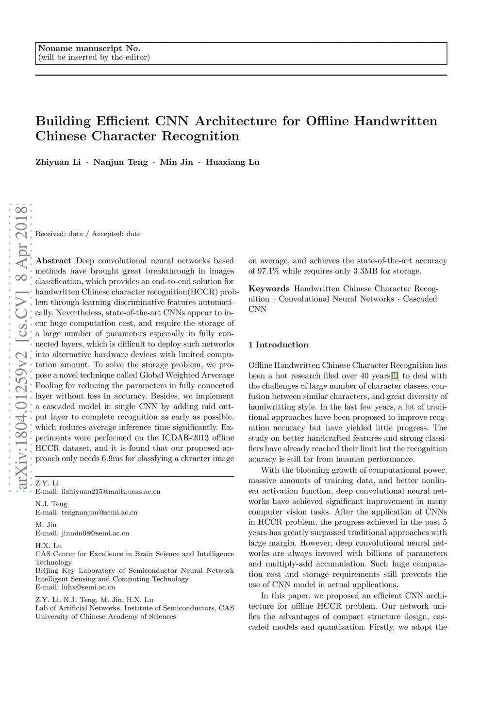 Building Efficient CNN Architecture for Offline Handwritten Chinese