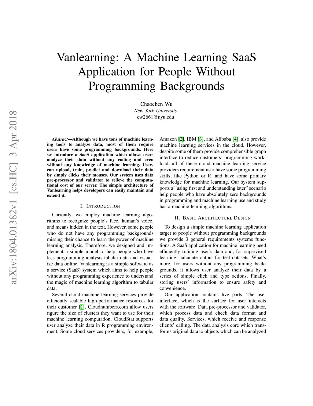 Although we have tons of machine learning tools to analyze data, most of them require users have some programming backgrounds. Here we introduce a SaaS application which allows users analyze their data without any coding and even without any knowledge of machine learning. Users can upload, train, predict and download their data by simply clicks their mouses. Our system uses data pre-processor and validator to relieve the computational cost of our server. The simple architecture of Vanlearning helps developers can easily maintain and extend it.