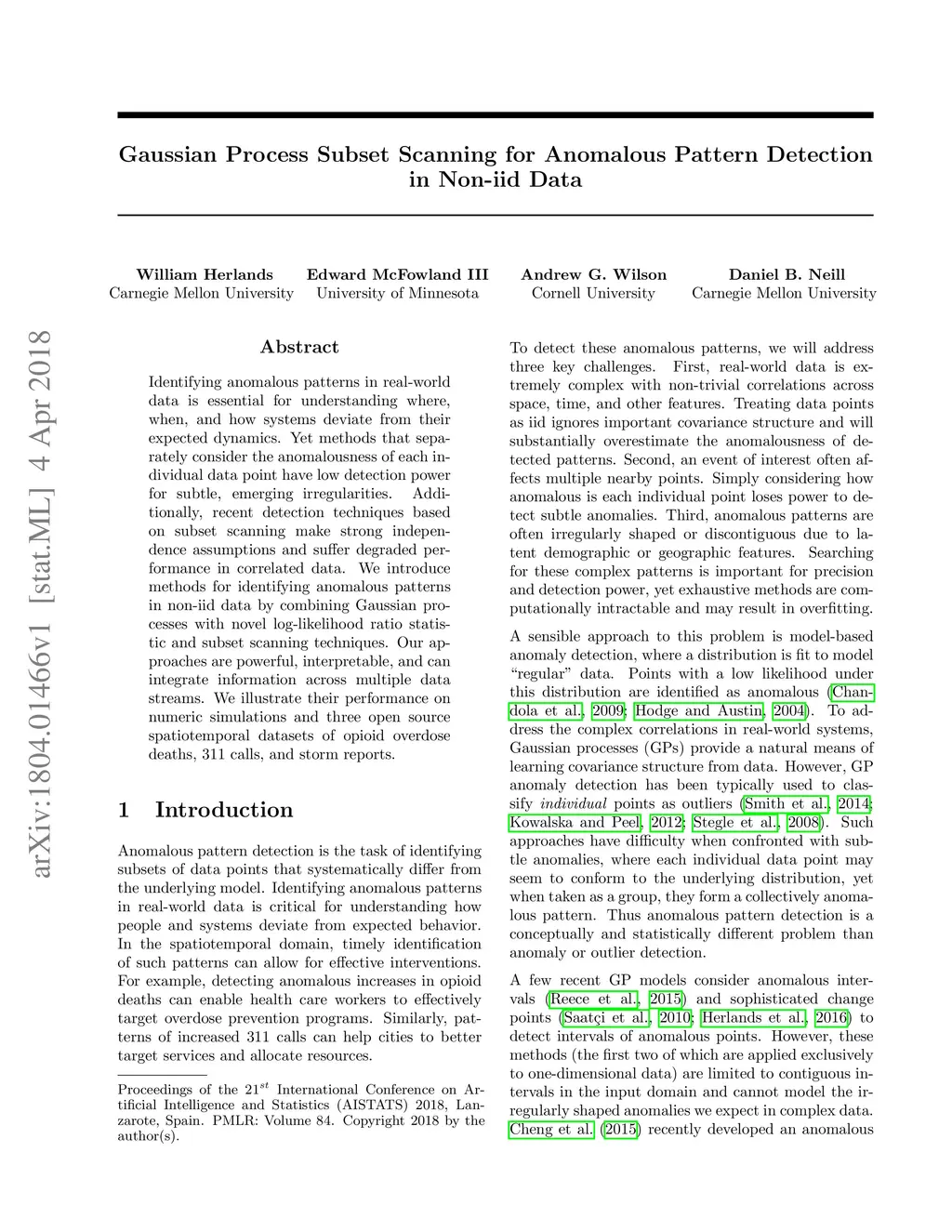 Identifying anomalous patterns in real-world data is essential for understanding where, when, and how systems deviate from their expected dynamics. Yet methods that separately consider the anomalousness of each individual data point have low detection power for subtle, emerging irregularities. Additionally, recent detection techniques based on subset scanning make strong independence assumptions and suffer degraded performance in correlated data. We introduce methods for identifying anomalous patterns in non-iid data by combining Gaussian processes with novel log-likelihood ratio statistic and subset scanning techniques. Our approaches are powerful, interpretable, and can integrate information across multiple data streams. We illustrate their performance on numeric simulations and three open source spatiotemporal datasets of opioid overdose deaths, 311 calls, and storm reports.