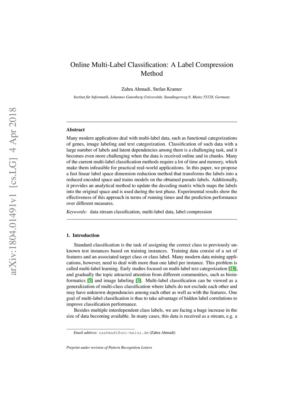 Many modern applications deal with multi-label data, such as functional categorizations of genes, image labeling and text categorization. Classification of such data with a large number of labels and latent dependencies among them is a challenging task, and it becomes even more challenging when the data is received online and in chunks. Many of the current multi-label classification methods require a lot of time and memory, which make them infeasible for practical real-world applications. In this paper, we propose a fast linear label space dimension reduction method that transforms the labels into a reduced encoded space and trains models on the obtained pseudo labels. Additionally, it provides an analytical method to update the decoding matrix which maps the labels into the original space and is used during the test phase. Experimental results show the effectiveness of this approach in terms of running times and the prediction performance over different measures.