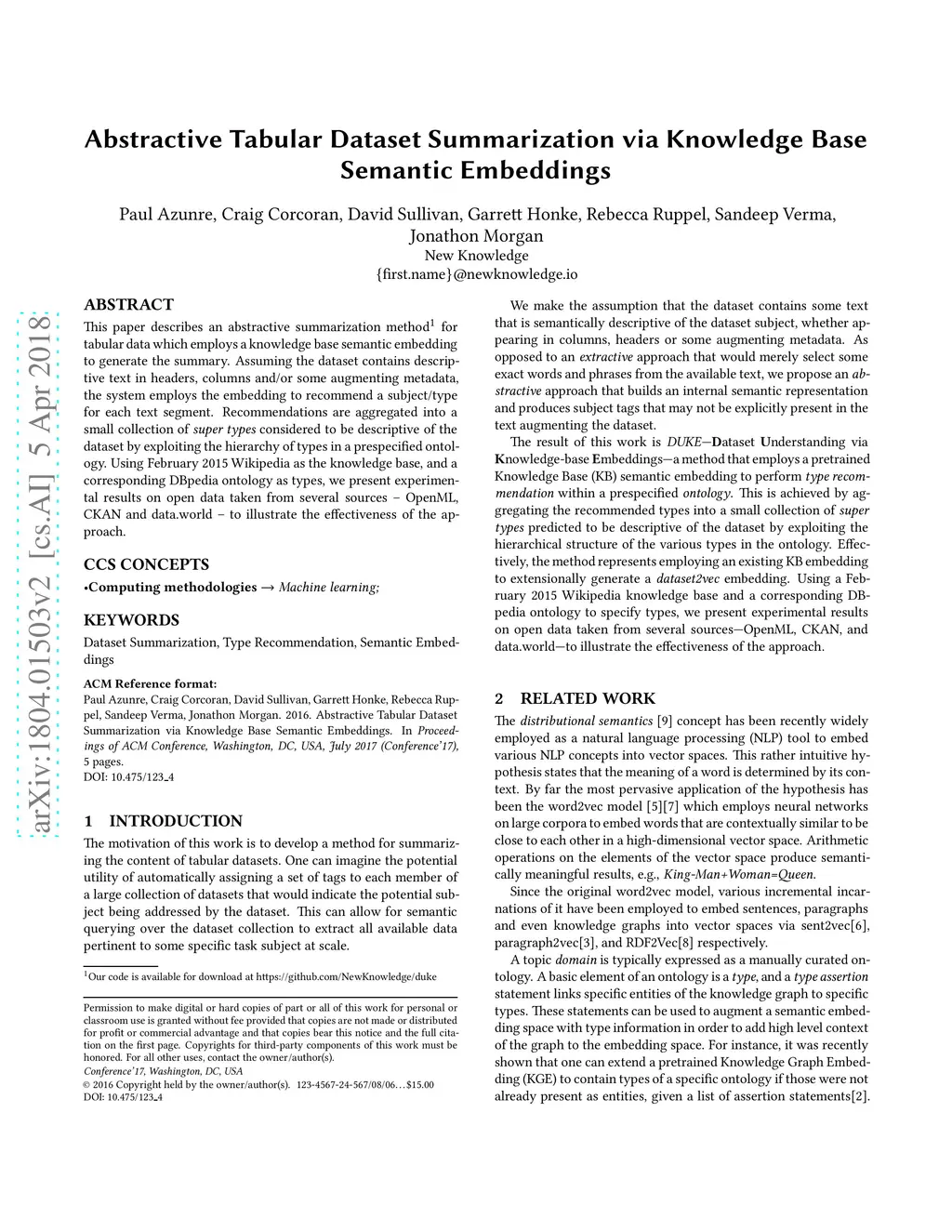 This paper describes an abstractive summarization method for tabular data which employs a knowledge base semantic embedding to generate the summary. Assuming the dataset contains descriptive text in headers, columns and/or some augmenting metadata, the system employs the embedding to recommend a subject/type for each text segment. Recommendations are aggregated into a small collection of super types considered to be descriptive of the dataset by exploiting the hierarchy of types in a pre-specified ontology. Using February 2015 Wikipedia as the knowledge base, and a corresponding DBpedia ontology as types, we present experimental results on open data taken from several sources--OpenML, CKAN and data.world--to illustrate the effectiveness of the approach.
