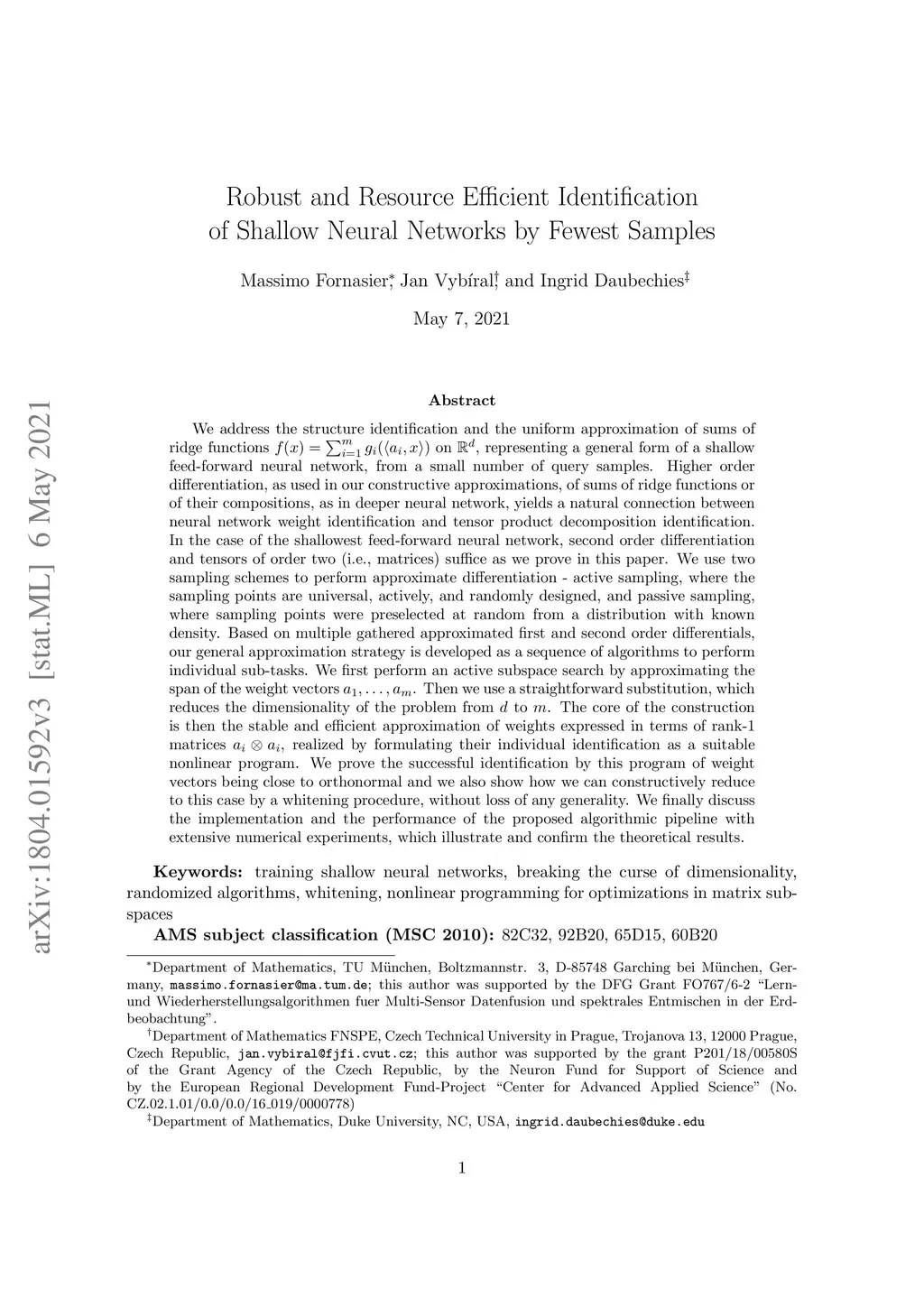 We address the structure identification and the uniform approximation of sums of ridge functions on , representing a general form of a shallow feed-forward neural network, from a small number of query samples. Higher order differentiation, as used in our constructive approximations, of sums of ridge functions or of their compositions, as in deeper neural network, yields a natural connection between neural network weight identification and tensor product decomposition identification. In the case of the shallowest feed-forward neural network, second order differentiation and tensors of order two (i.e., matrices) suffice as we prove in this paper. We use two sampling schemes to perform approximate differentiation - active sampling, where the sampling points are universal, actively, and randomly designed, and passive sampling, where sampling points were preselected at random from a distribution with known density. Based on multiple gathered approximated first and second order differentials, our general approximation strategy is developed as a sequence of algorithms to perform individual sub-tasks. We first perform an active subspace search by approximating the span of the weight vectors . Then we use a straightforward substitution, which reduces the dimensionality of the problem from to . The core of the construction is then the stable and efficient approximation of weights expressed in terms of rank- matrices , realized by formulating their individual identification as a suitable nonlinear program. We prove the successful identification by this program of weight vectors being close to orthonormal and we also show how we can costructively reduce to this case by a whitening procedure, without loss of any generality.
