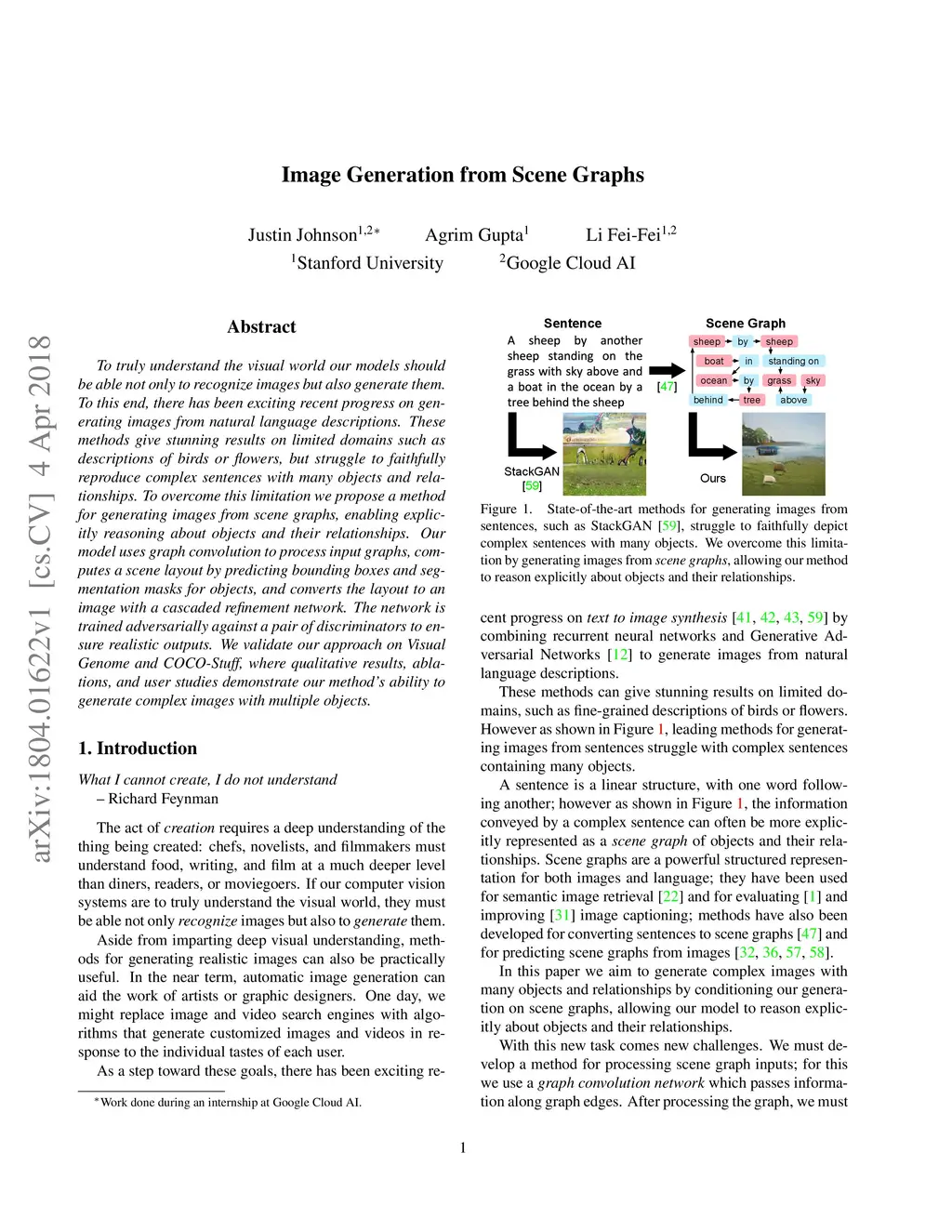 To truly understand the visual world our models should be able not only to recognize images but also generate them. To this end, there has been exciting recent progress on generating images from natural language descriptions. These methods give stunning results on limited domains such as descriptions of birds or flowers, but struggle to faithfully reproduce complex sentences with many objects and relationships. To overcome this limitation we propose a method for generating images from scene graphs, enabling explicitly reasoning about objects and their relationships. Our model uses graph convolution to process input graphs, computes a scene layout by predicting bounding boxes and segmentation masks for objects, and converts the layout to an image with a cascaded refinement network. The network is trained adversarially against a pair of discriminators to ensure realistic outputs. We validate our approach on Visual Genome and COCO-Stuff, where qualitative results, ablations, and user studies demonstrate our method's ability to generate complex images with multiple objects.