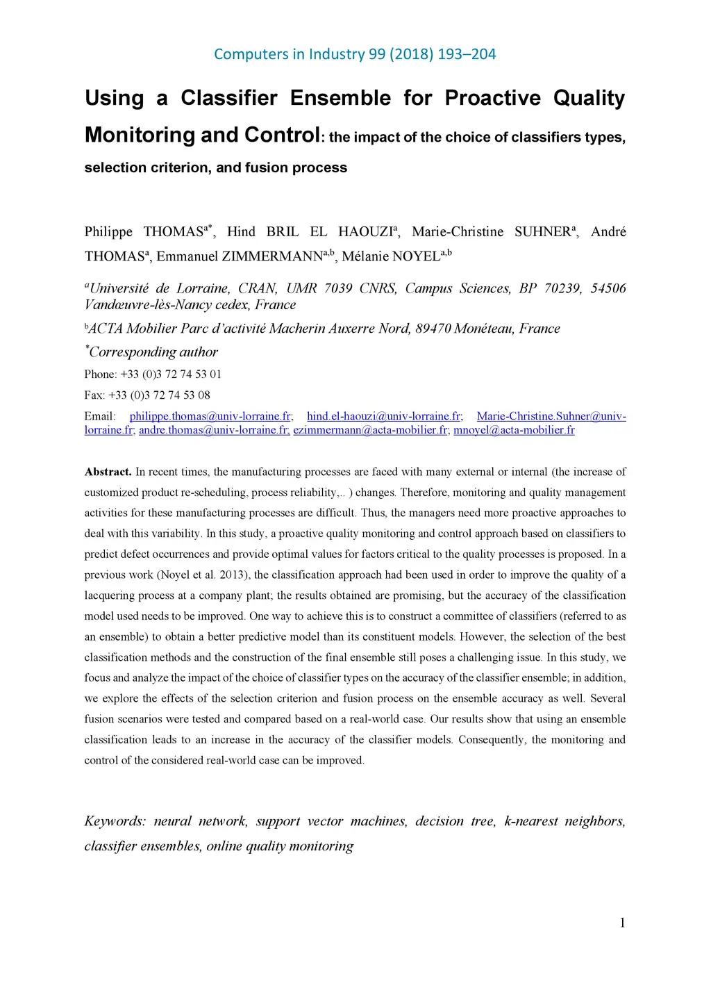 In recent times, the manufacturing processes are faced with many external or internal (the increase of customized product rescheduling , process reliability,..) changes. Therefore, monitoring and quality management activities for these manufacturing processes are difficult. Thus, the managers need more proactive approaches to deal with this variability. In this study, a proactive quality monitoring and control approach based on classifiers to predict defect occurrences and provide optimal values for factors critical to the quality processes is proposed. In a previous work (Noyel et al. 2013), the classification approach had been used in order to improve the quality of a lacquering process at a company plant; the results obtained are promising, but the accuracy of the classification model used needs to be improved. One way to achieve this is to construct a committee of classifiers (referred to as an ensemble) to obtain a better predictive model than its constituent models. However, the selection of the best classification methods and the construction of the final ensemble still poses a challenging issue. In this study, we focus and analyze the impact of the choice of classifier types on the accuracy of the classifier ensemble; in addition, we explore the effects of the selection criterion and fusion process on the ensemble accuracy as well. Several fusion scenarios were tested and compared based on a real-world case. Our results show that using an ensemble classification leads to an increase in the accuracy of the classifier models. Consequently, the monitoring and control of the considered real-world case can be improved.