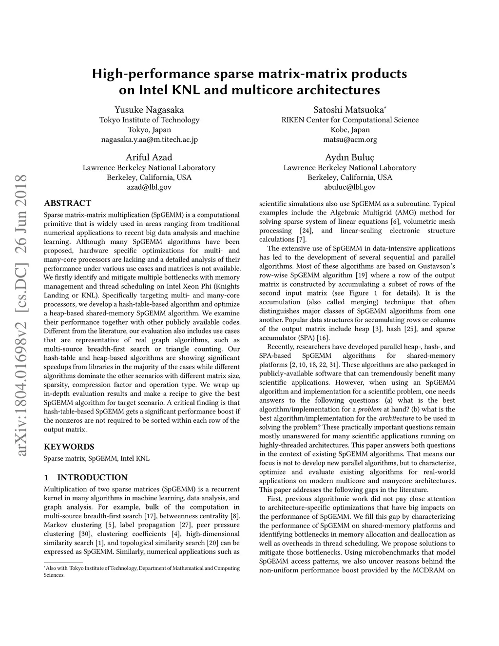 Sparse matrix-matrix multiplication (SpGEMM) is a computational primitive that is widely used in areas ranging from traditional numerical applications to recent big data analysis and machine learning. Although many SpGEMM algorithms have been proposed, hardware specific optimizations for multi- and many-core processors are lacking and a detailed analysis of their performance under various use cases and matrices is not available. We firstly identify and mitigate multiple bottlenecks with memory management and thread scheduling on Intel Xeon Phi (Knights Landing or KNL). Specifically targeting multi- and many-core processors, we develop a hash-table-based algorithm and optimize a heap-based shared-memory SpGEMM algorithm. We examine their performance together with other publicly available codes. Different from the literature, our evaluation also includes use cases that are representative of real graph algorithms, such as multi-source breadth-first search or triangle counting. Our hash-table and heap-based algorithms are showing significant speedups from libraries in the majority of the cases while different algorithms dominate the other scenarios with different matrix size, sparsity, compression factor and operation type. We wrap up in-depth evaluation results and make a recipe to give the best SpGEMM algorithm for target scenario. A critical finding is that hash-table-based SpGEMM gets a significant performance boost if the nonzeros are not required to be sorted within each row of the output matrix.