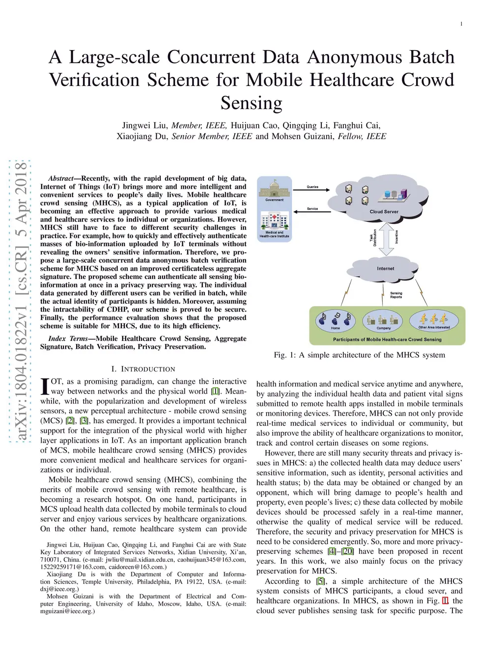 Recently, with the rapid development of big data, Internet of Things (IoT) brings more and more intelligent and convenient services to people's daily lives. Mobile healthcare crowd sensing (MHCS), as a typical application of IoT, is becoming an effective approach to provide various medical and healthcare services to individual or organizations. However, MHCS still have to face to different security challenges in practice. For example, how to quickly and effectively authenticate masses of bio-information uploaded by IoT terminals without revealing the owners' sensitive information. Therefore, we propose a large-scale concurrent data anonymous batch verification scheme for MHCS based on an improved certificateless aggregate signature. The proposed scheme can authenticate all sensing bio-information at once in a privacy preserving way. The individual data generated by different users can be verified in batch, while the actual identity of participants is hidden. Moreover, assuming the intractability of CDHP, our scheme is proved to be secure. Finally, the performance evaluation shows that the proposed scheme is suitable for MHCS, due to its high efficiency.