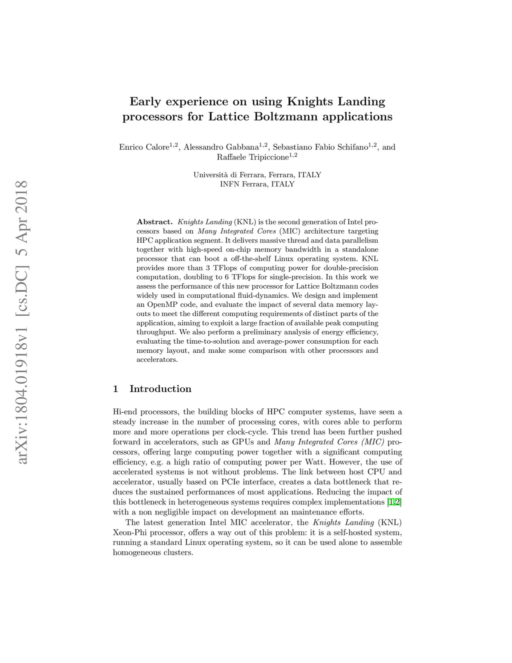 The Knights Landing (KNL) is the codename for the latest generation of Intel processors based on Intel Many Integrated Core (MIC) architecture. It relies on massive thread and data parallelism, and fast on-chip memory. This processor operates in standalone mode, booting an off-the-shelf Linux operating system. The KNL peak performance is very high - approximately 3 Tflops in double precision and 6 Tflops in single precision - but sustained performance depends critically on how well all parallel features of the processor are exploited by real-life applications. We assess the performance of this processor for Lattice Boltzmann codes, widely used in computational fluid-dynamics. In our OpenMP code we consider several memory data-layouts that meet the conflicting computing requirements of distinct parts of the application, and sustain a large fraction of peak performance. We make some performance comparisons with other processors and accelerators, and also discuss the impact of the various memory layouts on energy efficiency.