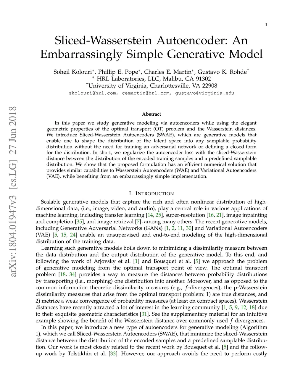 In this paper we study generative modeling via autoencoders while using the elegant geometric properties of the optimal transport (OT) problem and the Wasserstein distances. We introduce Sliced-Wasserstein Autoencoders (SWAE), which are generative models that enable one to shape the distribution of the latent space into any samplable probability distribution without the need for training an adversarial network or defining a closed-form for the distribution. In short, we regularize the autoencoder loss with the sliced-Wasserstein distance between the distribution of the encoded training samples and a predefined samplable distribution. We show that the proposed formulation has an efficient numerical solution that provides similar capabilities to Wasserstein Autoencoders (WAE) and Variational Autoencoders (VAE), while benefiting from an embarrassingly simple implementation.