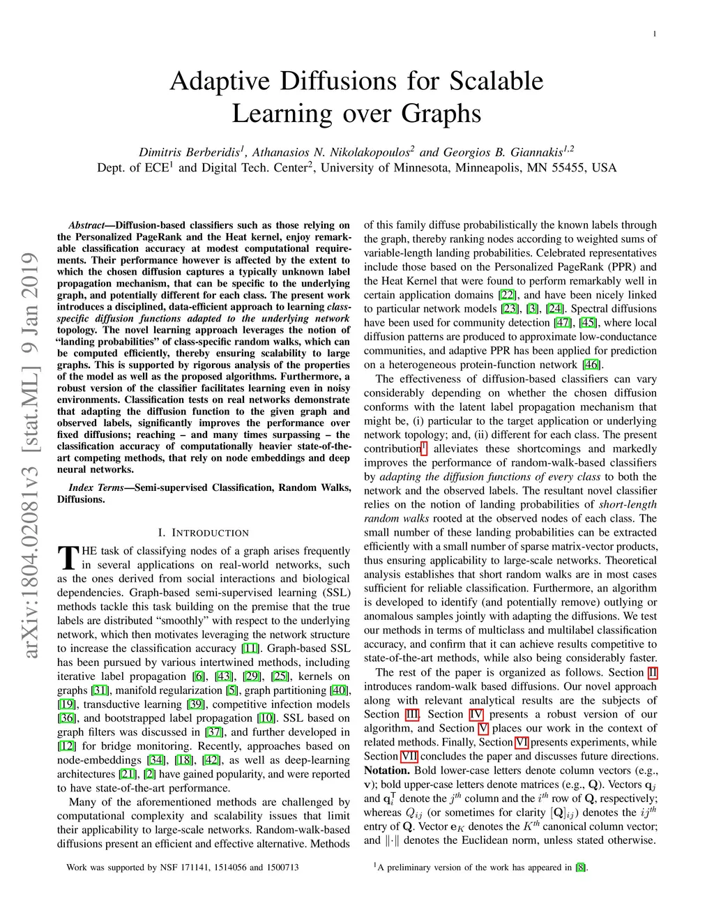 Adaptive Diffusions for Scalable Learning over Graphs