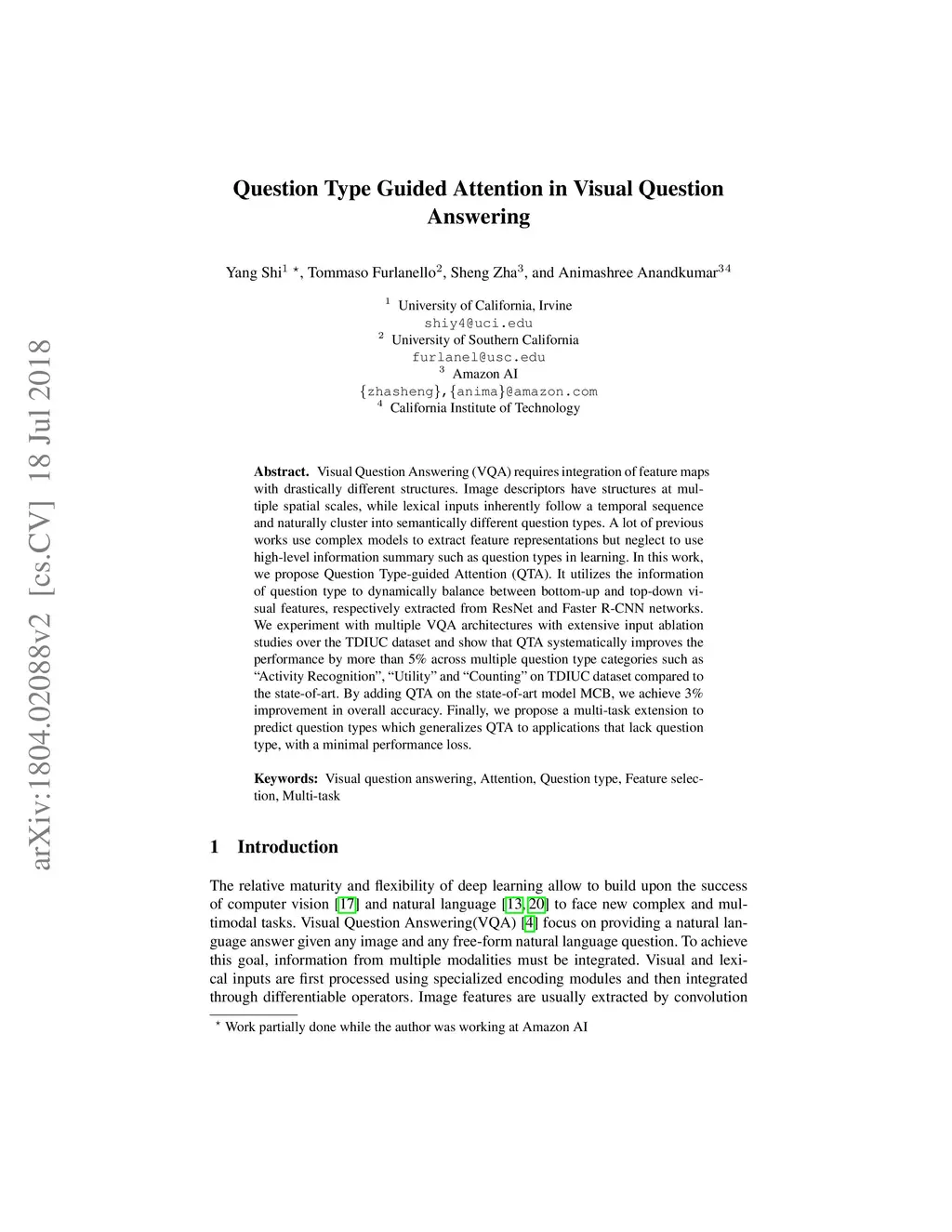 Visual Question Answering (VQA) requires integration of feature maps with drastically different structures and focus of the correct regions. Image descriptors have structures at multiple spatial scales, while lexical inputs inherently follow a temporal sequence and naturally cluster into semantically different question types. A lot of previous works use complex models to extract feature representations but neglect to use high-level information summary such as question types in learning. In this work, we propose Question Type-guided Attention (QTA). It utilizes the information of question type to dynamically balance between bottom-up and top-down visual features, respectively extracted from ResNet and Faster R-CNN networks. We experiment with multiple VQA architectures with extensive input ablation studies over the TDIUC dataset and show that QTA systematically improves the performance by more than 5% across multiple question type categories such as "Activity Recognition", "Utility" and "Counting" on TDIUC dataset. By adding QTA on the state-of-art model MCB, we achieve 3% improvement for overall accuracy. Finally, we propose a multi-task extension to predict question types which generalizes QTA to applications that lack of question type, with minimal performance loss.