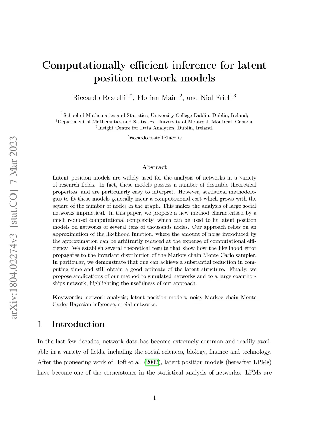 Latent position models are widely used for the analysis of networks in a variety of research fields. In fact, these models possess a number of desirable theoretical properties, and are particularly easy to interpret. However, statistical methodologies to fit these models generally incur a computational cost which grows with the square of the number of nodes in the graph. This makes the analysis of large social networks impractical. In this paper, we propose a new method characterised by a much reduced computational complexity, which can be used to fit latent position models on networks of several tens of thousands nodes. Our approach relies on an approximation of the likelihood function, where the amount of noise introduced by the approximation can be arbitrarily reduced at the expense of computational efficiency. We establish several theoretical results that show how the likelihood error propagates to the invariant distribution of the Markov chain Monte Carlo sampler. In particular, we demonstrate that one can achieve a substantial reduction in computing time and still obtain a good estimate of the latent structure. Finally, we propose applications of our method to simulated networks and to a large coauthorships network, highlighting the usefulness of our approach.