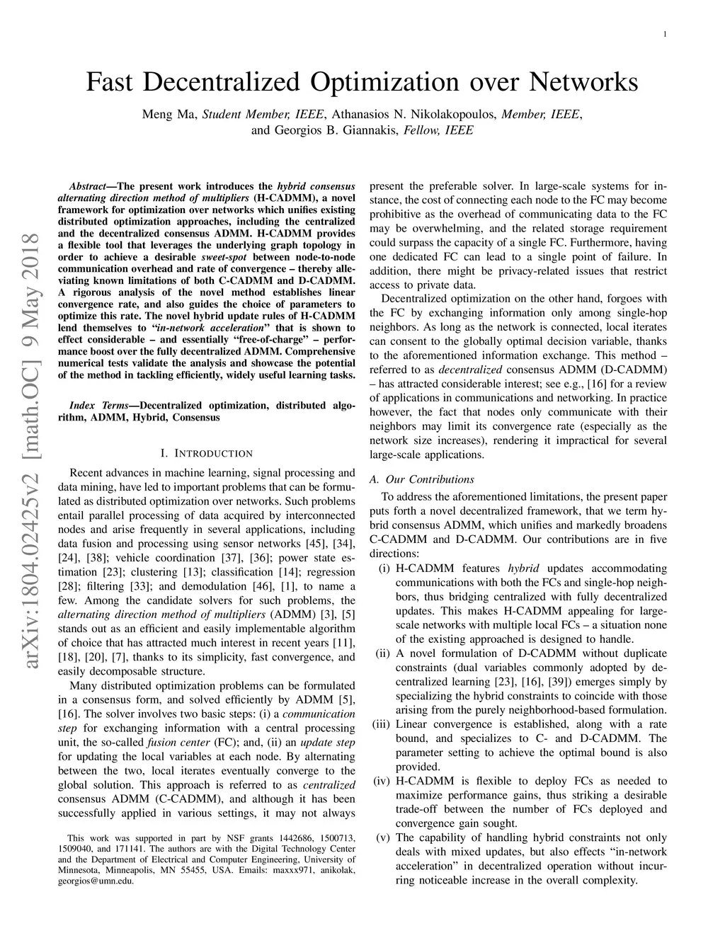 The present work introduces the hybrid consensus alternating direction method of multipliers (H-CADMM), a novel framework for optimization over networks which unifies existing distributed optimization approaches, including the centralized and the decentralized consensus ADMM. H-CADMM provides a flexible tool that leverages the underlying graph topology in order to achieve a desirable sweet-spot between node-to-node communication overhead and rate of convergence -- thereby alleviating known limitations of both C-CADMM and D-CADMM. A rigorous analysis of the novel method establishes linear convergence rate, and also guides the choice of parameters to optimize this rate. The novel hybrid update rules of H-CADMM lend themselves to "in-network acceleration" that is shown to effect considerable -- and essentially "free-of-charge" -- performance boost over the fully decentralized ADMM. Comprehensive numerical tests validate the analysis and showcase the potential of the method in tackling efficiently, widely useful learning tasks.