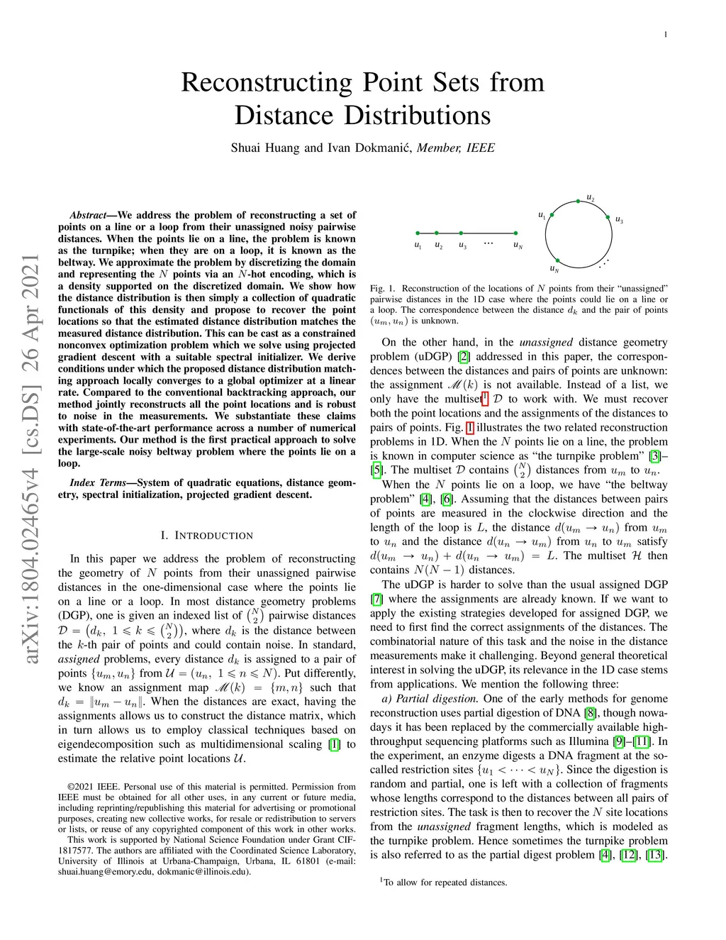 We address the problem of reconstructing a set of points on a line or a loop from their unassigned noisy pairwise distances. When the points lie on a line, the problem is known as the turnpike; when they are on a loop, it is known as the beltway. We approximate the problem by discretizing the domain and representing the points via an -hot encoding, which is a density supported on the discretized domain. We show how the distance distribution is then simply a collection of quadratic functionals of this density and propose to recover the point locations so that the estimated distance distribution matches the measured distance distribution. This can be cast as a constrained nonconvex optimization problem which we solve using projected gradient descent with a suitable spectral initializer. We derive conditions under which the proposed distance distribution matching approach locally converges to a global optimizer at a linear rate. Compared to the conventional backtracking approach, our method jointly reconstructs all the point locations and is robust to noise in the measurements. We substantiate these claims with state-of-the-art performance across a number of numerical experiments. Our method is the first practical approach to solve the large-scale noisy beltway problem where the points lie on a loop.