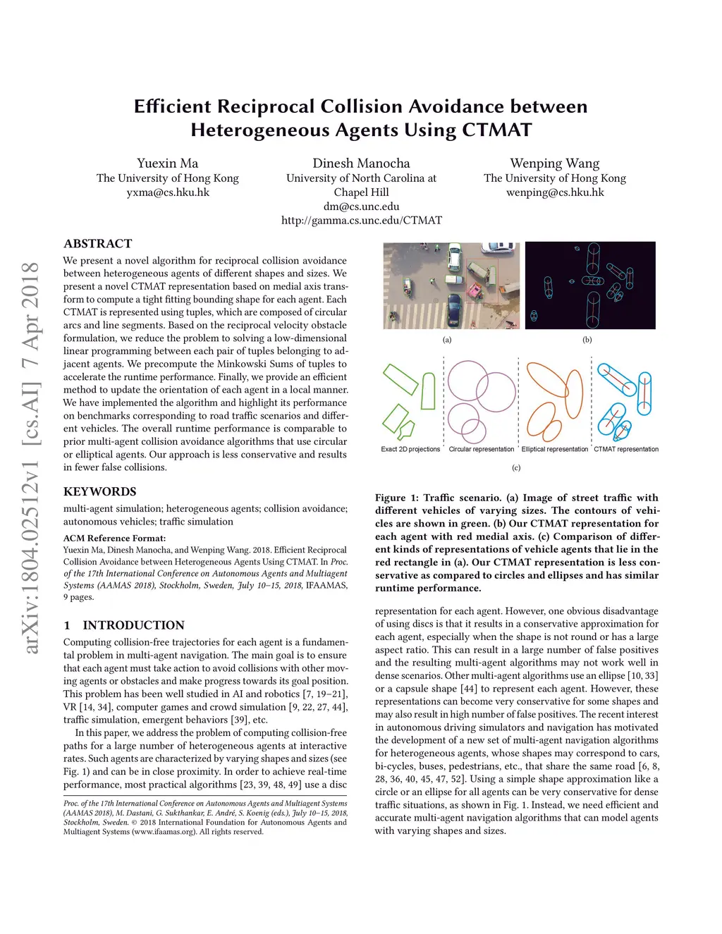 We present a novel algorithm for reciprocal collision avoidance between heterogeneous agents of different shapes and sizes. We present a novel CTMAT representation based on medial axis transform to compute a tight fitting bounding shape for each agent. Each CTMAT is represented using tuples, which are composed of circular arcs and line segments. Based on the reciprocal velocity obstacle formulation, we reduce the problem to solving a low-dimensional linear programming between each pair of tuples belonging to adjacent agents. We precompute the Minkowski Sums of tuples to accelerate the runtime performance. Finally, we provide an efficient method to update the orientation of each agent in a local manner. We have implemented the algorithm and highlight its performance on benchmarks corresponding to road traffic scenarios and different vehicles. The overall runtime performance is comparable to prior multi-agent collision avoidance algorithms that use circular or elliptical agents. Our approach is less conservative and results in fewer false collisions.