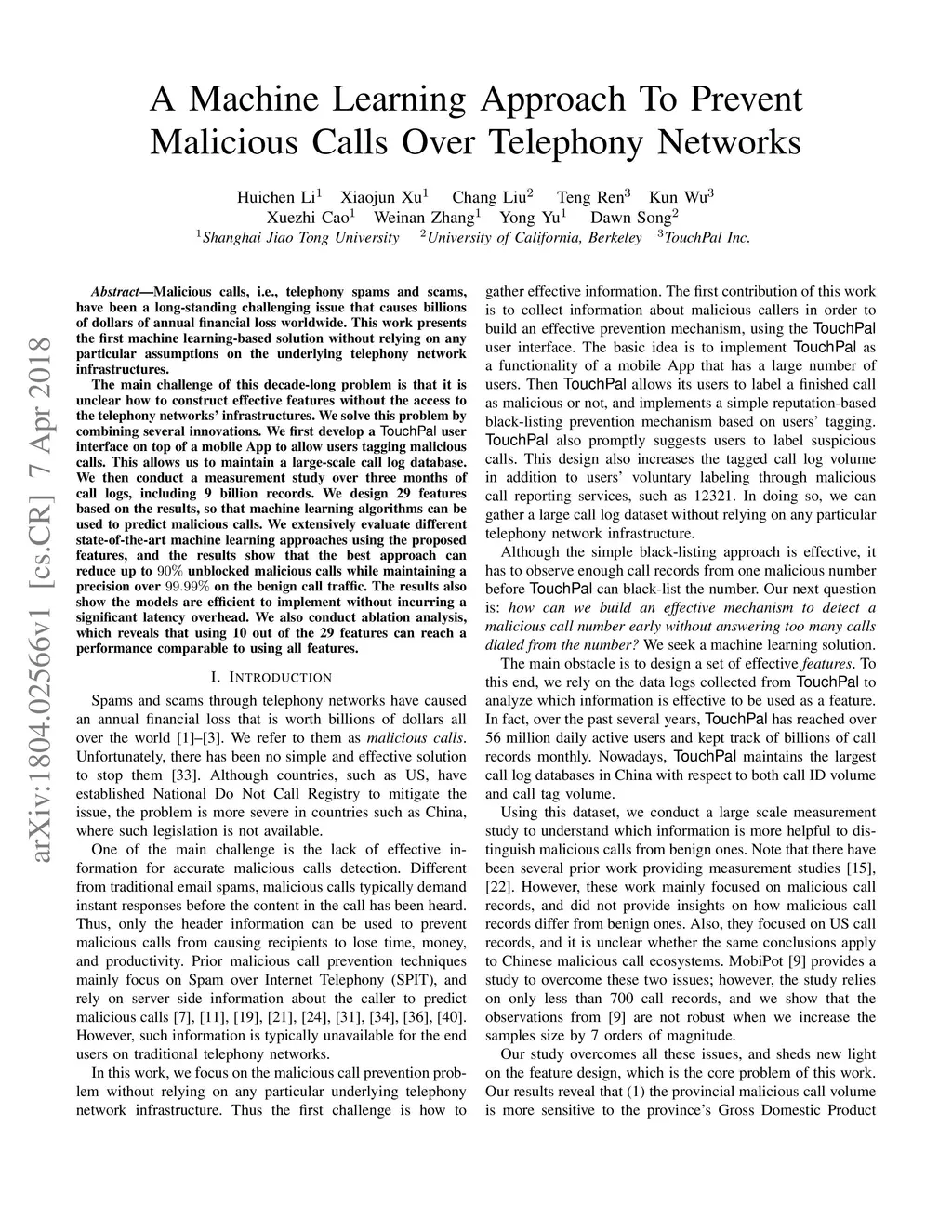 A Machine Learning Approach To Prevent Malicious Calls Over Telephony