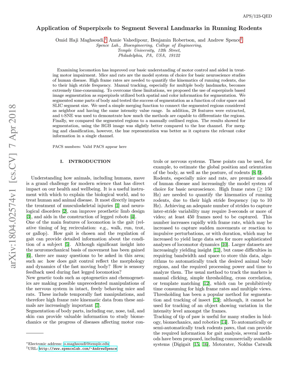 Examining locomotion has improved our basic understanding of motor control and aided in treating motor impairment. Mice and rats are the model system of choice for basic neuroscience studies of human disease. High frame rates are needed to quantify the kinematics of running rodents, due to their high stride frequency. Manual tracking, especially for multiple body landmarks, becomes extremely time-consuming. To overcome these limitations, we proposed the use of superpixels based image segmentation as superpixels utilized both spatial and color information for segmentation. We segmented some parts of body and tested the success of segmentation as a function of color space and SLIC segment size. We used a simple merging function to connect the segmented regions considered as neighbor and having the same intensity value range. In addition, 28 features were extracted, and t-SNE was used to demonstrate how much the methods are capable to differentiate the regions. Finally, we compared the segmented regions to a manually outlined region. The results showed for segmentation, using the RGB image was slightly better compared to the hue channel. For merg- ing and classification, however, the hue representation was better as it captures the relevant color information in a single channel.