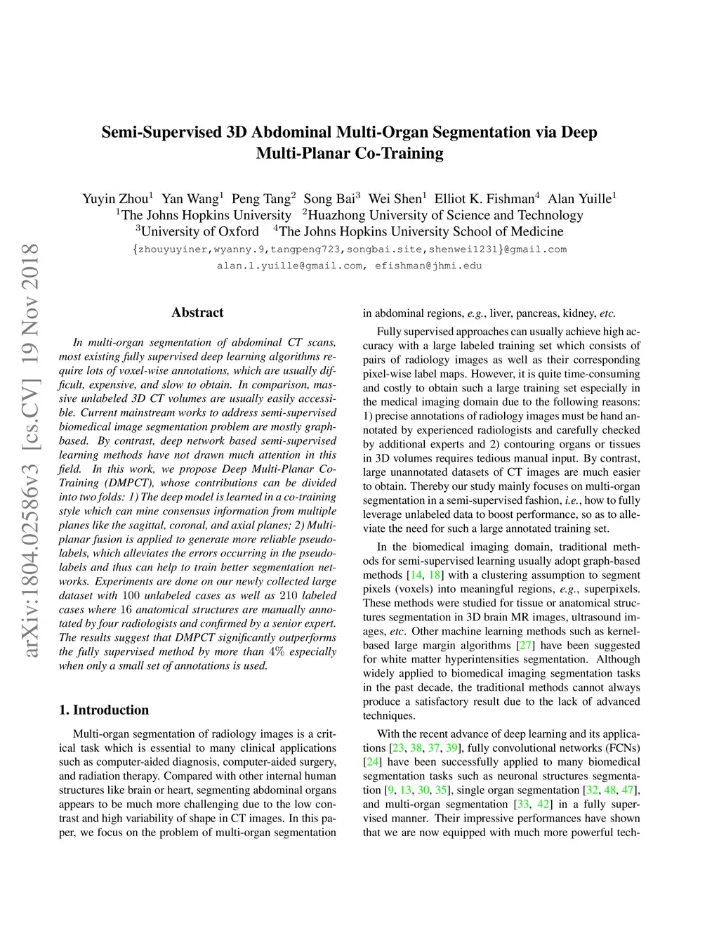 Semi-Supervised Multi-Organ Segmentation via Deep Multi-Planar