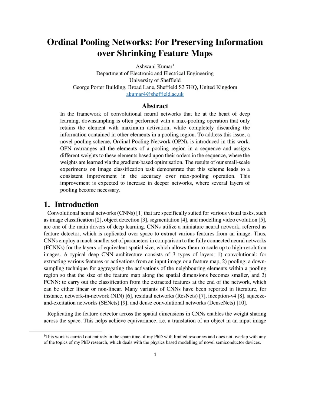 In the framework of convolutional neural networks that lie at the heart of deep learning, downsampling is often performed with a max-pooling operation that only retains the element with maximum activation, while completely discarding the information contained in other elements in a pooling region. To address this issue, a novel pooling scheme, Ordinal Pooling Network (OPN), is introduced in this work. OPN rearranges all the elements of a pooling region in a sequence and assigns different weights to these elements based upon their orders in the sequence, where the weights are learned via the gradient-based optimisation. The results of our small-scale experiments on image classification task demonstrate that this scheme leads to a consistent improvement in the accuracy over max-pooling operation. This improvement is expected to increase in deeper networks, where several layers of pooling become necessary.