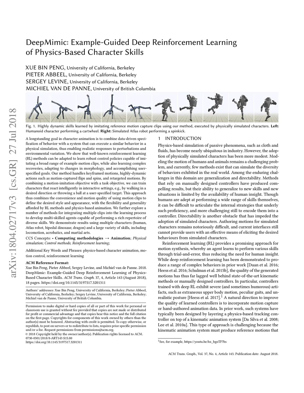 DeepMimic: Example-Guided Deep Reinforcement Learning of Physics-Based