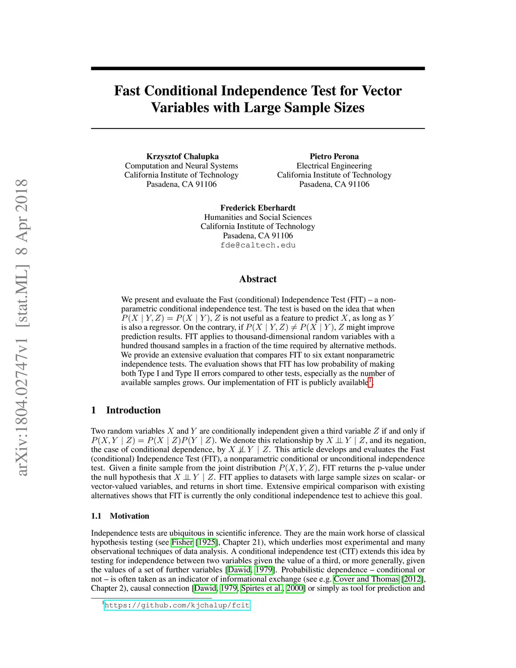 We present and evaluate the Fast (conditional) Independence Test (FIT) -- a nonparametric conditional independence test. The test is based on the idea that when , is not useful as a feature to predict , as long as is also a regressor. On the contrary, if , might improve prediction results. FIT applies to thousand-dimensional random variables with a hundred thousand samples in a fraction of the time required by alternative methods. We provide an extensive evaluation that compares FIT to six extant nonparametric independence tests. The evaluation shows that FIT has low probability of making both Type I and Type II errors compared to other tests, especially as the number of available samples grows. Our implementation of FIT is publicly available.