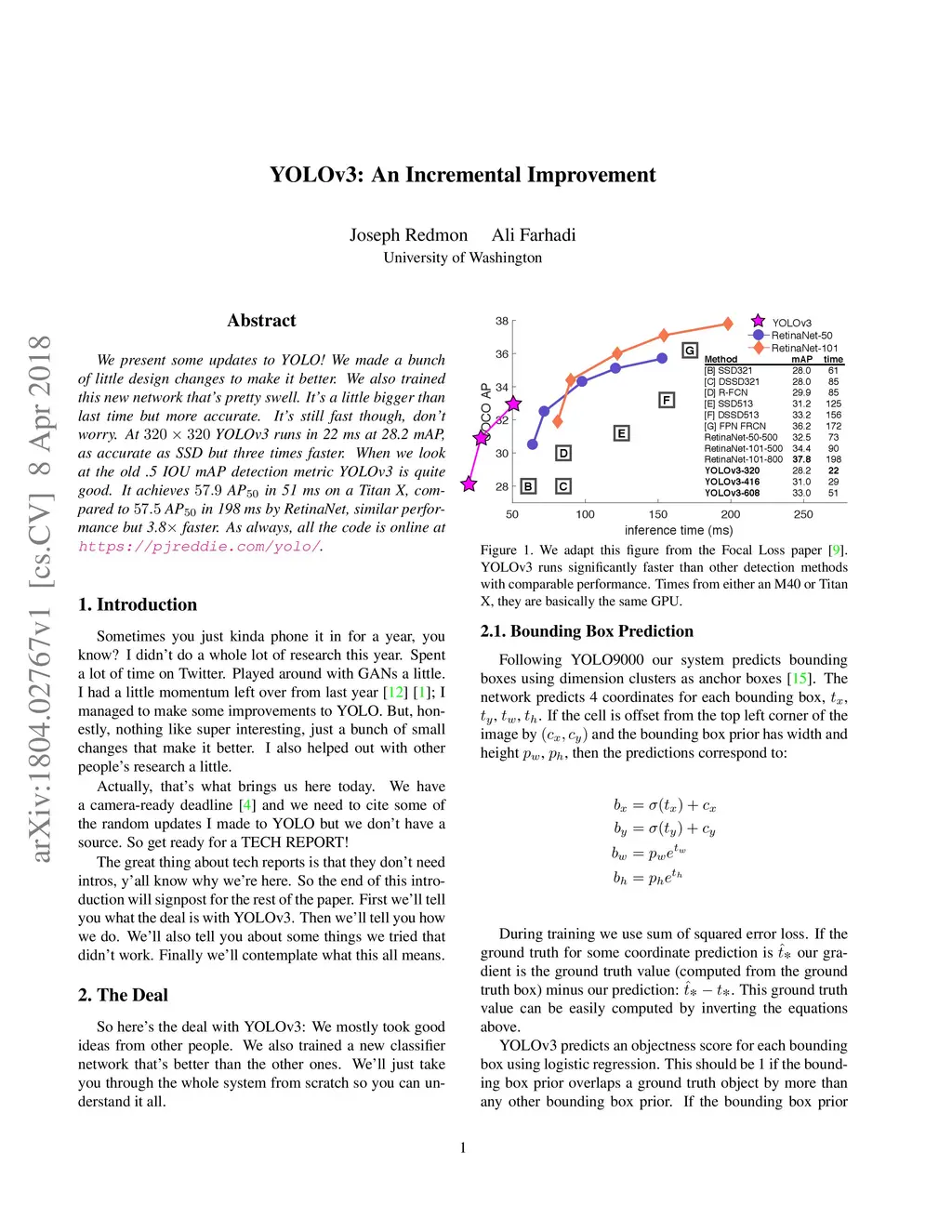 We present some updates to YOLO! We made a bunch of little design changes to make it better. We also trained this new network that's pretty swell. It's a little bigger than last time but more accurate. It's still fast though, don't worry. At 320x320 YOLOv3 runs in 22 ms at 28.2 mAP, as accurate as SSD but three times faster. When we look at the old .5 IOU mAP detection metric YOLOv3 is quite good. It achieves 57.9 mAP@50 in 51 ms on a Titan X, compared to 57.5 mAP@50 in 198 ms by RetinaNet, similar performance but 3.8x faster. As always, all the code is online at https://pjreddie.com/yolo/