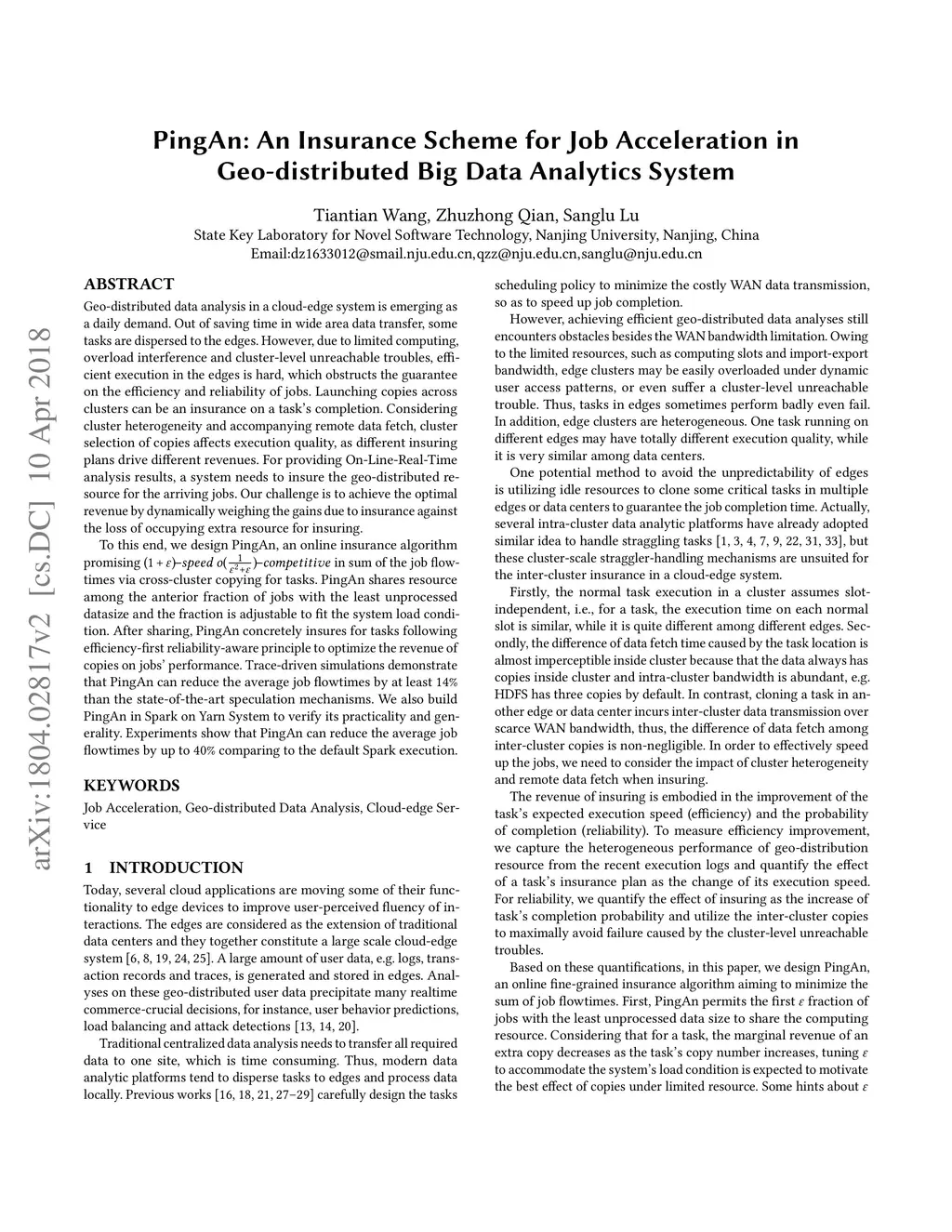 PingAn: An Insurance Scheme for Job Acceleration in Geo-distributed Big