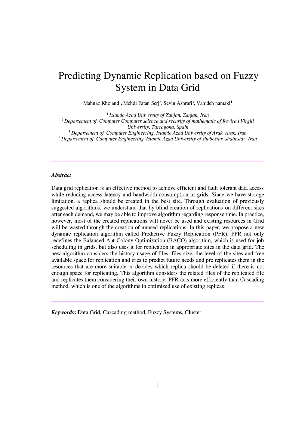 Data grid replication is an effective method to achieve efficient and fault tolerant data access while reducing access latency and bandwidth consumption in grids. Since we have storage limitation, a replica should be created in the best site. Through evaluation of previously suggested algorithms, we understand that by blind creation of replications on different sites after each demand, we may be able to improve algorithm regarding response time. In practice, however, most of the created replications will never be used and existing resources in Grid will be wasted through the creation of unused replications. In this paper, we propose a new dynamic replication algorithm called Predictive Fuzzy Replication (PFR). PFR not only redefines the Balanced Ant Colony Optimization (BACO) algorithm, which is used for job scheduling in grids, but also uses it for replication in appropriate sites in the data grid. The new algorithm considers the history usage of files, files size, the level of the sites and free available space for replication and tries to predict future needs and pre replicates them in the resources that are more suitable or decides which replica should be deleted if there is not enough space for replicating. This algorithm considers the related files of the replicated file and replicates them considering their own history. PFR acts more efficiently than Cascading method, which is one of the algorithms in optimized use of existing replicas.