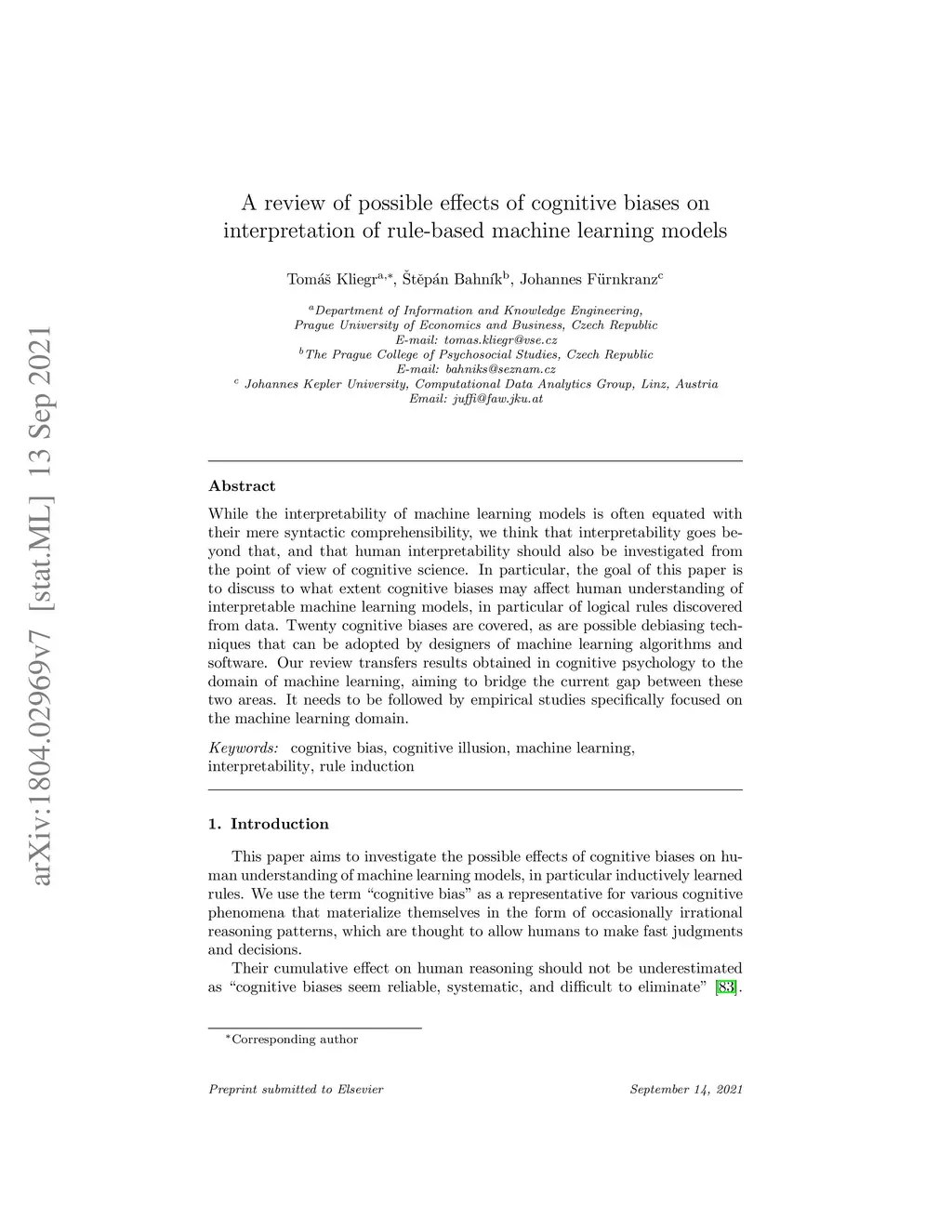 While the interpretability of machine learning models is often equated with their mere syntactic comprehensibility, we think that interpretability goes beyond that, and that human interpretability should also be investigated from the point of view of cognitive science. The goal of this paper is to discuss to what extent cognitive biases may affect human understanding of interpretable machine learning models, in particular of logical rules discovered from data. Twenty cognitive biases are covered, as are possible debiasing techniques that can be adopted by designers of machine learning algorithms and software. Our review transfers results obtained in cognitive psychology to the domain of machine learning, aiming to bridge the current gap between these two areas. It needs to be followed by empirical studies specifically focused on the machine learning domain.