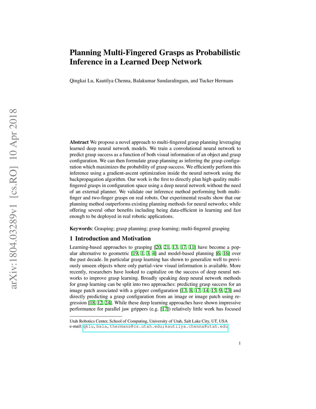 Planning Multi-Fingered Grasps as Probabilistic Inference in a Learned