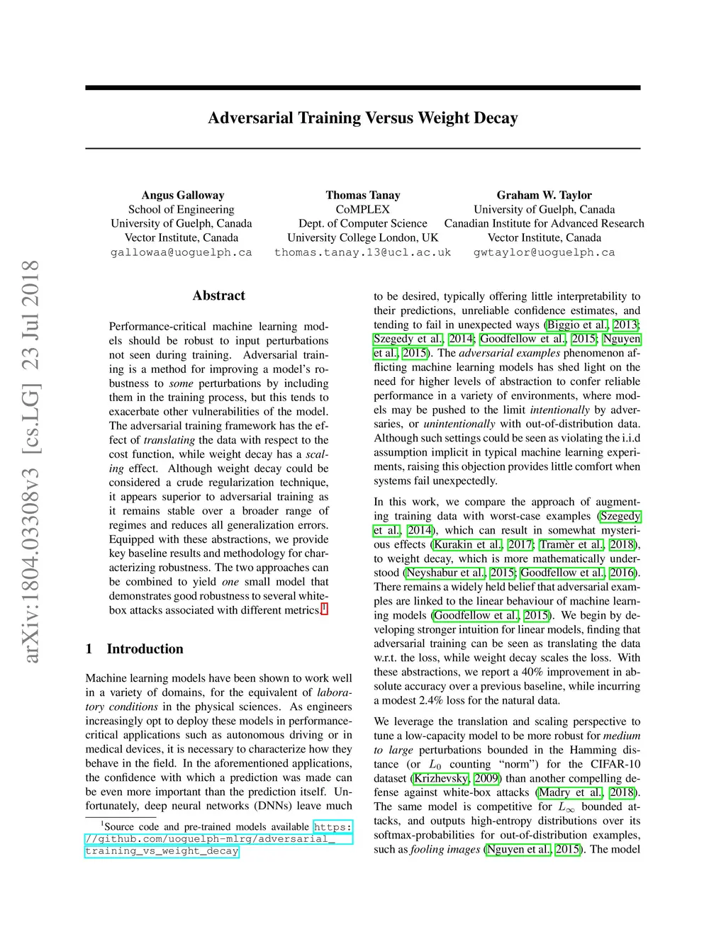 Performance-critical machine learning models should be robust to input perturbations not seen during training. Adversarial training is a method for improving a model's robustness to some perturbations by including them in the training process, but this tends to exacerbate other vulnerabilities of the model. The adversarial training framework has the effect of translating the data with respect to the cost function, while weight decay has a scaling effect. Although weight decay could be considered a crude regularization technique, it appears superior to adversarial training as it remains stable over a broader range of regimes and reduces all generalization errors. Equipped with these abstractions, we provide key baseline results and methodology for characterizing robustness. The two approaches can be combined to yield one small model that demonstrates good robustness to several white-box attacks associated with different metrics.