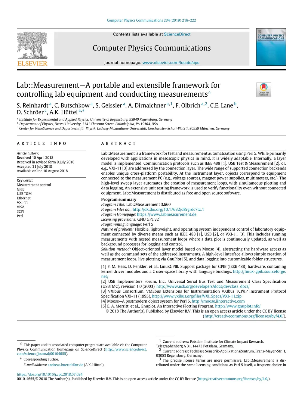 Lab::Measurement is a framework for test and measurement automatization using Perl 5. While primarily developed with applications in mesoscopic physics in mind, it is widely adaptable. Internally, a layer model is implemented. Communication protocols such as IEEE 488, USB Test & Measurement, or, e.g., VXI-11 are addressed by the connection layer. The wide range of supported connection backends enables unique cross-platform portability. At the instrument layer, objects correspond to equipment connected to the measurement PC (e.g., voltage sources, magnet power supplies, multimeters, etc.). The high-level sweep layer automates the creation of measurement loops, with simultaneous plotting and data logging. An extensive unit testing framework is used to verify functionality even without connected equipment. Lab::Measurement is distributed as free and open source software.