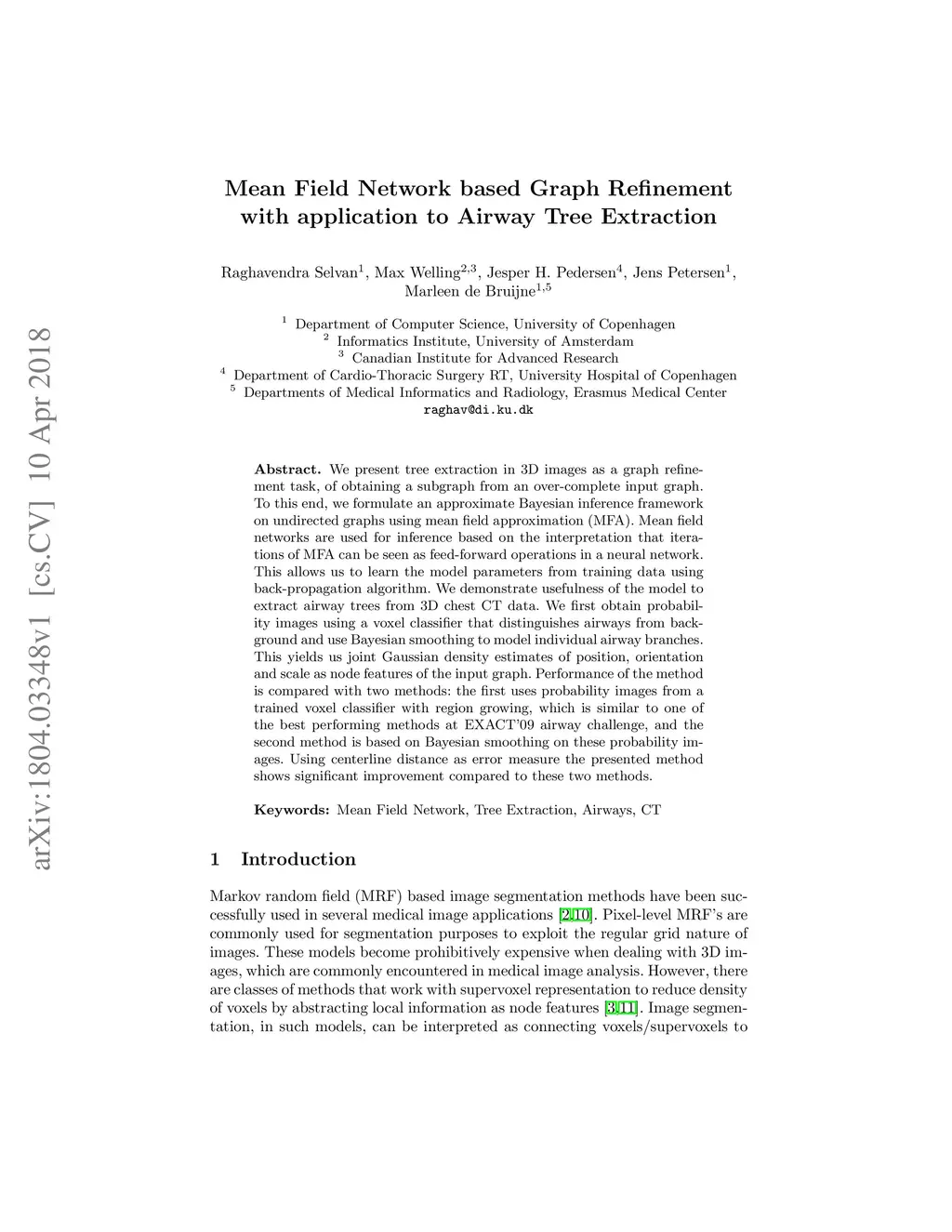 We present tree extraction in 3D images as a graph refinement task, of obtaining a subgraph from an over-complete input graph. To this end, we formulate an approximate Bayesian inference framework on undirected graphs using mean field approximation (MFA). Mean field networks are used for inference based on the interpretation that iterations of MFA can be seen as feed-forward operations in a neural network. This allows us to learn the model parameters from training data using back-propagation algorithm. We demonstrate usefulness of the model to extract airway trees from 3D chest CT data. We first obtain probability images using a voxel classifier that distinguishes airways from background and use Bayesian smoothing to model individual airway branches. This yields us joint Gaussian density estimates of position, orientation and scale as node features of the input graph. Performance of the method is compared with two methods: the first uses probability images from a trained voxel classifier with region growing, which is similar to one of the best performing methods at EXACT'09 airway challenge, and the second method is based on Bayesian smoothing on these probability images. Using centerline distance as error measure the presented method shows significant improvement compared to these two methods.
