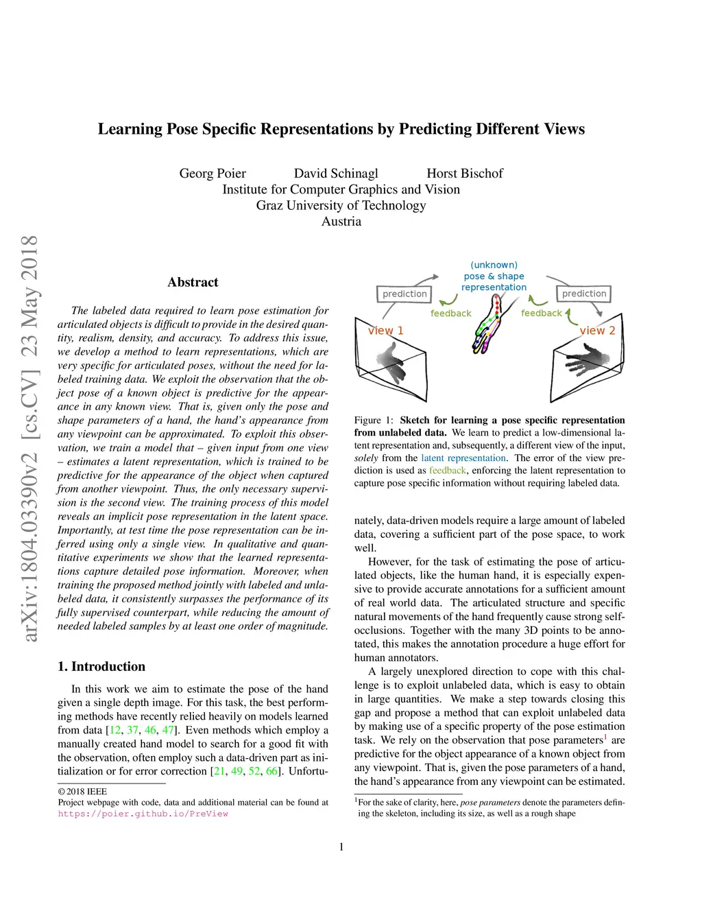 The labeled data required to learn pose estimation for articulated objects is difficult to provide in the desired quantity, realism, density, and accuracy. To address this issue, we develop a method to learn representations, which are very specific for articulated poses, without the need for labeled training data. We exploit the observation that the object pose of a known object is predictive for the appearance in any known view. That is, given only the pose and shape parameters of a hand, the hand's appearance from any viewpoint can be approximated. To exploit this observation, we train a model that -- given input from one view -- estimates a latent representation, which is trained to be predictive for the appearance of the object when captured from another viewpoint. Thus, the only necessary supervision is the second view. The training process of this model reveals an implicit pose representation in the latent space. Importantly, at test time the pose representation can be inferred using only a single view. In qualitative and quantitative experiments we show that the learned representations capture detailed pose information. Moreover, when training the proposed method jointly with labeled and unlabeled data, it consistently surpasses the performance of its fully supervised counterpart, while reducing the amount of needed labeled samples by at least one order of magnitude.