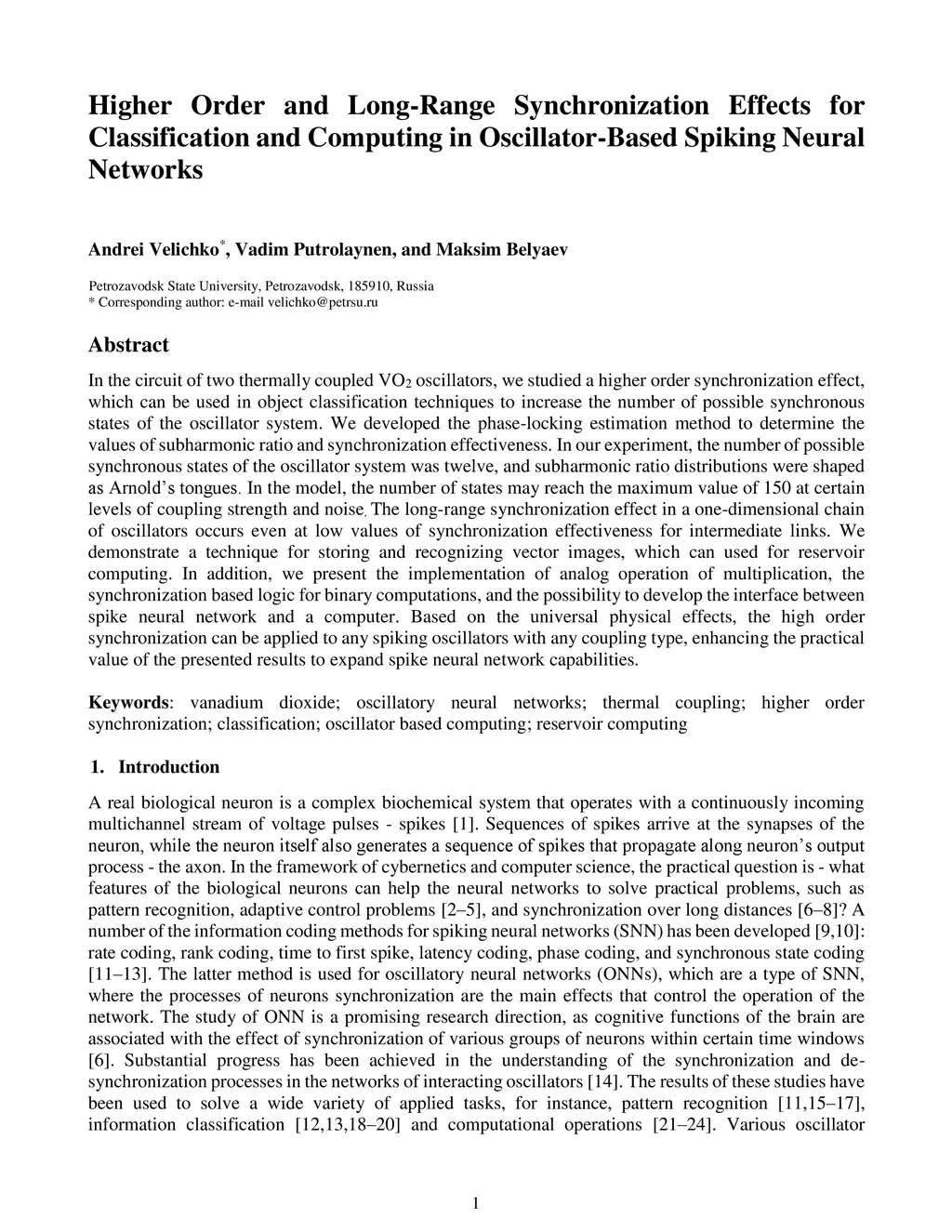 In the circuit of two thermally coupled VO2 oscillators, we studied a higher order synchronization effect, which can be used in object classification techniques to increase the number of possible synchronous states of the oscillator system. We developed the phase-locking estimation method to determine the values of subharmonic ratio and synchronization effectiveness. In our experiment, the number of possible synchronous states of the oscillator system was twelve, and subharmonic ratio distributions were shaped as Arnold's tongues. In the model, the number of states may reach the maximum value of 150 at certain levels of coupling strength and noise. The long-range synchronization effect in a one-dimensional chain of oscillators occurs even at low values of synchronization effectiveness for intermediate links. We demonstrate a technique for storing and recognizing vector images, which can used for reservoir computing. In addition, we present the implementation of analog operation of multiplication, the synchronization based logic for binary computations, and the possibility to develop the interface between spike neural network and a computer. Based on the universal physical effects, the high order synchronization can be applied to any spiking oscillators with any coupling type, enhancing the practical value of the presented results to expand spike neural network capabilities.