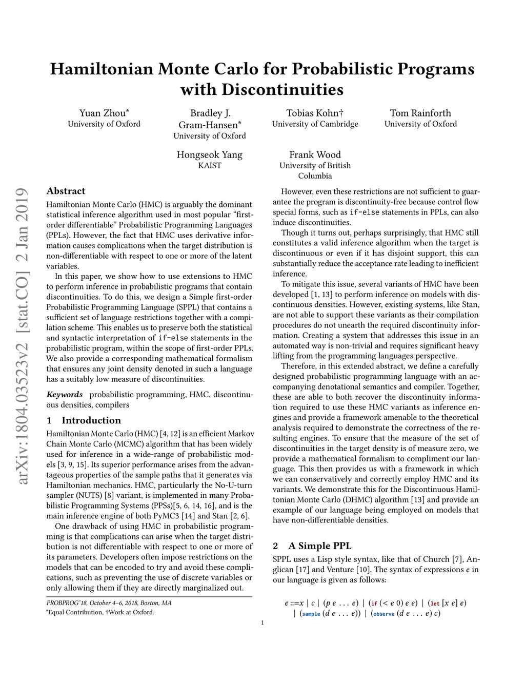 Hamiltonian Monte Carlo (HMC) is arguably the dominant statistical inference algorithm used in most popular "first-order differentiable" Probabilistic Programming Languages (PPLs). However, the fact that HMC uses derivative information causes complications when the target distribution is non-differentiable with respect to one or more of the latent variables. In this paper, we show how to use extensions to HMC to perform inference in probabilistic programs that contain discontinuities. To do this, we design a Simple first-order Probabilistic Programming Language (SPPL) that contains a sufficient set of language restrictions together with a compilation scheme. This enables us to preserve both the statistical and syntactic interpretation of if-else statements in the probabilistic program, within the scope of first-order PPLs. We also provide a corresponding mathematical formalism that ensures any joint density denoted in such a language has a suitably low measure of discontinuities.