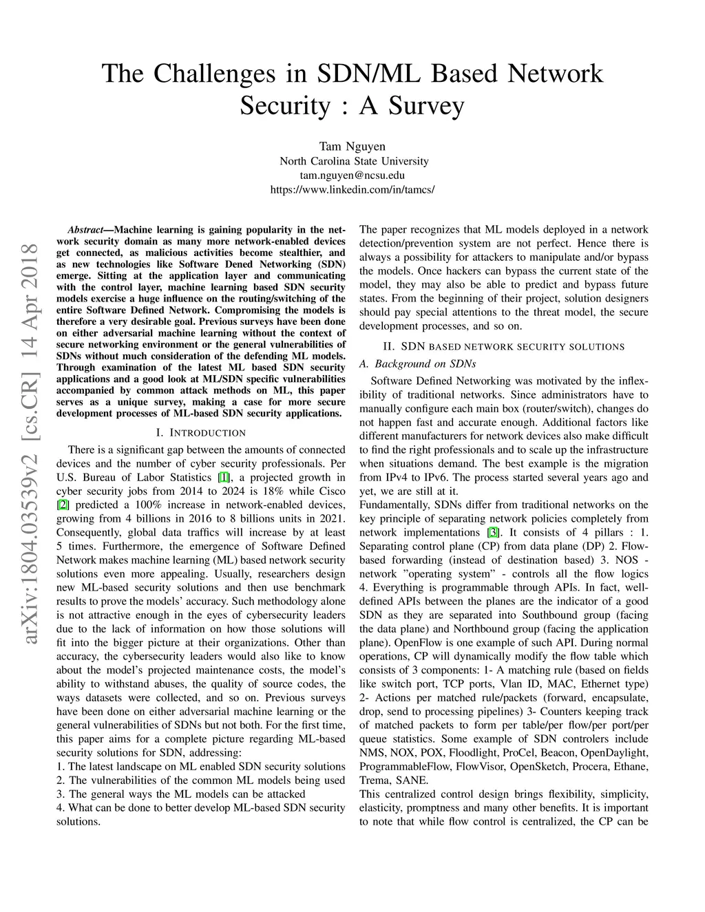 Machine Learning is gaining popularity in the network security domain as many more network-enabled devices get connected, as malicious activities become stealthier, and as new technologies like Software Defined Networking (SDN) emerge. Sitting at the application layer and communicating with the control layer, machine learning based SDN security models exercise a huge influence on the routing/switching of the entire SDN. Compromising the models is consequently a very desirable goal. Previous surveys have been done on either adversarial machine learning or the general vulnerabilities of SDNs but not both. Through examination of the latest ML-based SDN security applications and a good look at ML/SDN specific vulnerabilities accompanied by common attack methods on ML, this paper serves as a unique survey, making a case for more secure development processes of ML-based SDN security applications.