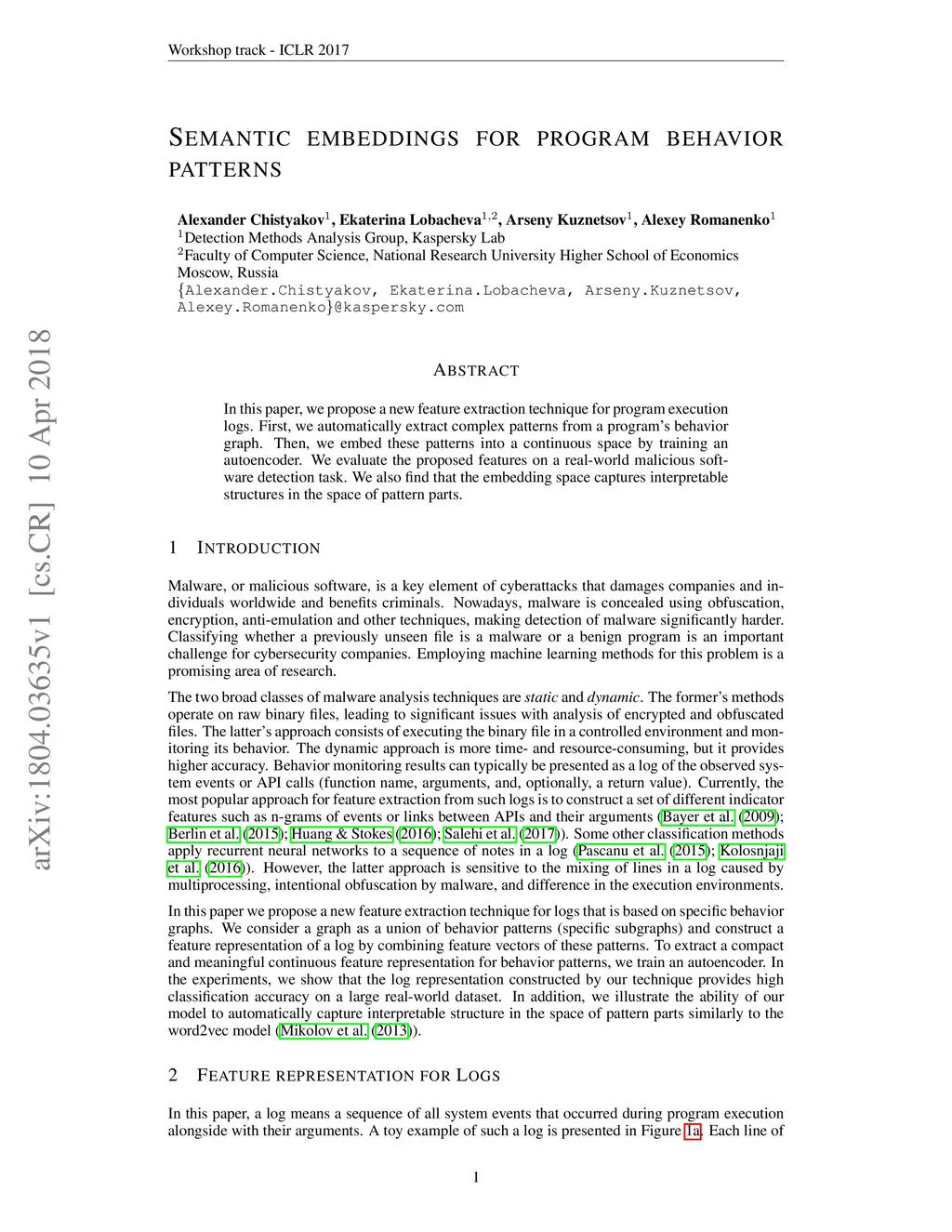 In this paper, we propose a new feature extraction technique for program execution logs. First, we automatically extract complex patterns from a program's behavior graph. Then, we embed these patterns into a continuous space by training an autoencoder. We evaluate the proposed features on a real-world malicious software detection task. We also find that the embedding space captures interpretable structures in the space of pattern parts.