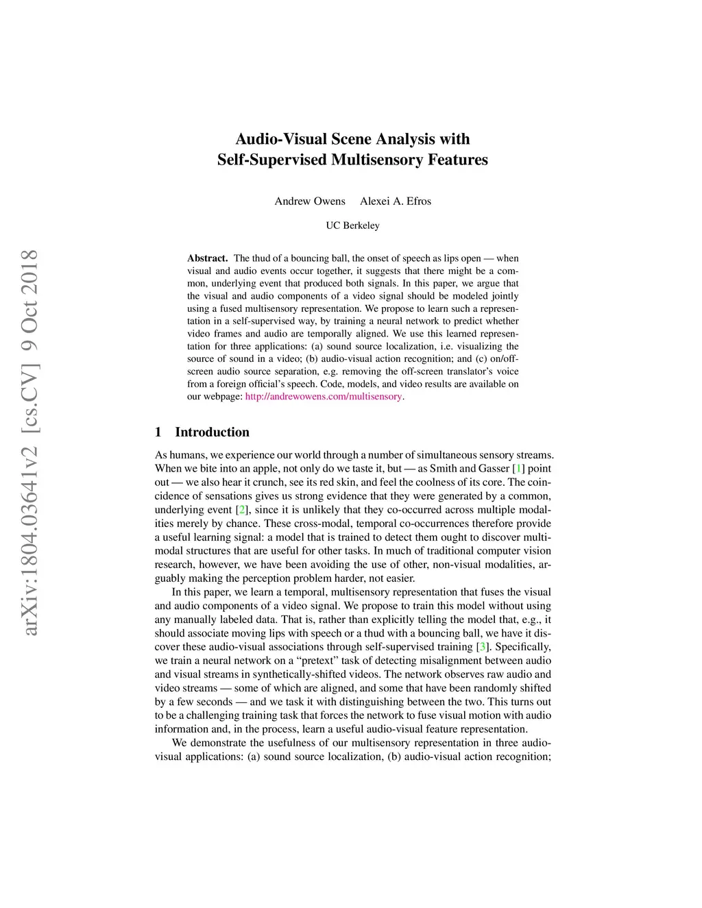The thud of a bouncing ball, the onset of speech as lips open -- when visual and audio events occur together, it suggests that there might be a common, underlying event that produced both signals. In this paper, we argue that the visual and audio components of a video signal should be modeled jointly using a fused multisensory representation. We propose to learn such a representation in a self-supervised way, by training a neural network to predict whether video frames and audio are temporally aligned. We use this learned representation for three applications: (a) sound source localization, i.e. visualizing the source of sound in a video; (b) audio-visual action recognition; and (c) on/off-screen audio source separation, e.g. removing the off-screen translator's voice from a foreign official's speech. Code, models, and video results are available on our webpage: http://andrewowens.com/multisensory