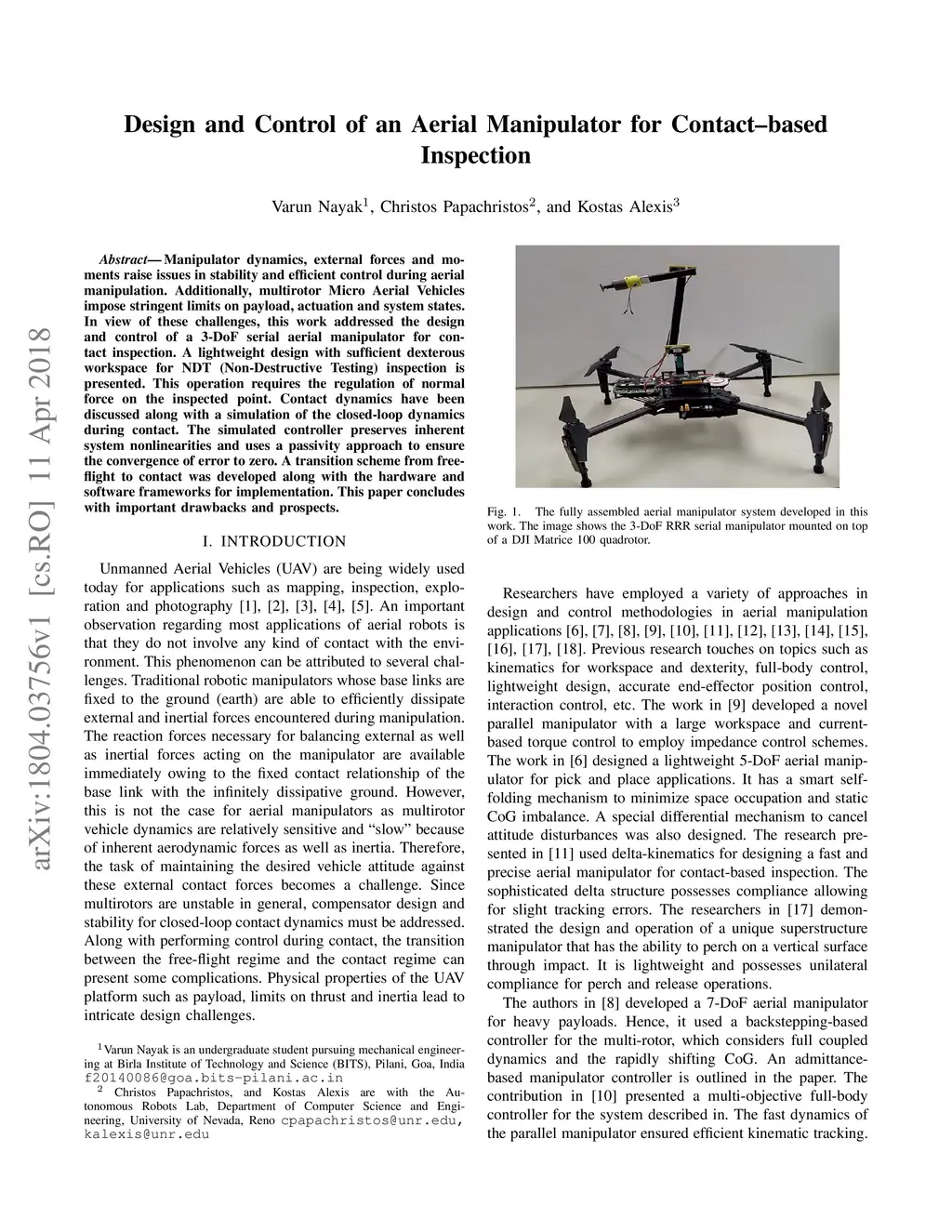 Manipulator dynamics, external forces and moments raise issues in stability and efficient control during aerial manipulation. Additionally, multirotor Micro Aerial Vehicles impose stringent limits on payload, actuation and system states. In view of these challenges, this work addressed the design and control of a 3-DoF serial aerial manipulator for contact inspection. A lightweight design with sufficient dexterous workspace for NDT (Non-Destructive Testing) inspection is presented. This operation requires the regulation of normal force on the inspected point. Contact dynamics have been discussed along with a simulation of the closed-loop dynamics during contact. The simulated controller preserves inherent system nonlinearities and uses a passivity approach to ensure the convergence of error to zero. A transition scheme from free-flight to contact was developed along with the hardware and software frameworks for implementation. This paper concludes with important drawbacks and prospects.