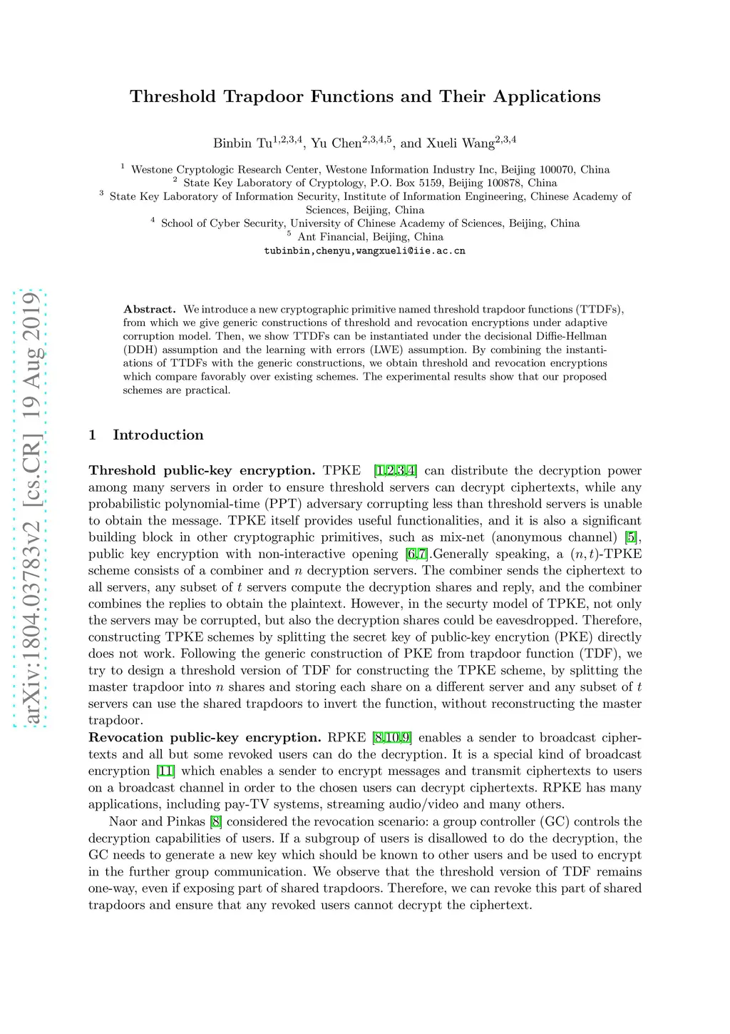 We introduce a cryptographic primitive named threshold trapdoor functions (TTDFs), from which we give generic constructions of threshold and revocation encryptions under adaptive corruption model. Then, we show TTDF can be instantiated under the decisional Diffie-Hellman (DDH) assumption and the learning with errors (LWE) assumption. By combining the instantiations of TTDF with the generic constructions, we obtain threshold and revocation encryptions which compare favorably over existing schemes. The experimental results show that our proposed schemes are practical.
