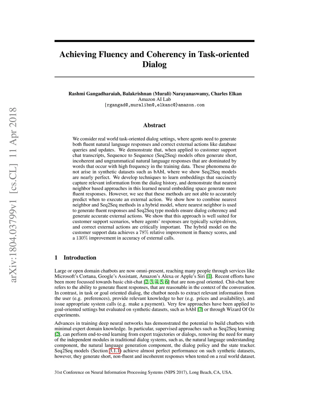 We consider real world task-oriented dialog settings, where agents need to generate both fluent natural language responses and correct external actions like database queries and updates. We demonstrate that, when applied to customer support chat transcripts, Sequence to Sequence (Seq2Seq) models often generate short, incoherent and ungrammatical natural language responses that are dominated by words that occur with high frequency in the training data. These phenomena do not arise in synthetic datasets such as bAbI, where we show Seq2Seq models are nearly perfect. We develop techniques to learn embeddings that succinctly capture relevant information from the dialog history, and demonstrate that nearest neighbor based approaches in this learned neural embedding space generate more fluent responses. However, we see that these methods are not able to accurately predict when to execute an external action. We show how to combine nearest neighbor and Seq2Seq methods in a hybrid model, where nearest neighbor is used to generate fluent responses and Seq2Seq type models ensure dialog coherency and generate accurate external actions. We show that this approach is well suited for customer support scenarios, where agents' responses are typically script-driven, and correct external actions are critically important. The hybrid model on the customer support data achieves a 78% relative improvement in fluency scores, and a 130% improvement in accuracy of external calls.