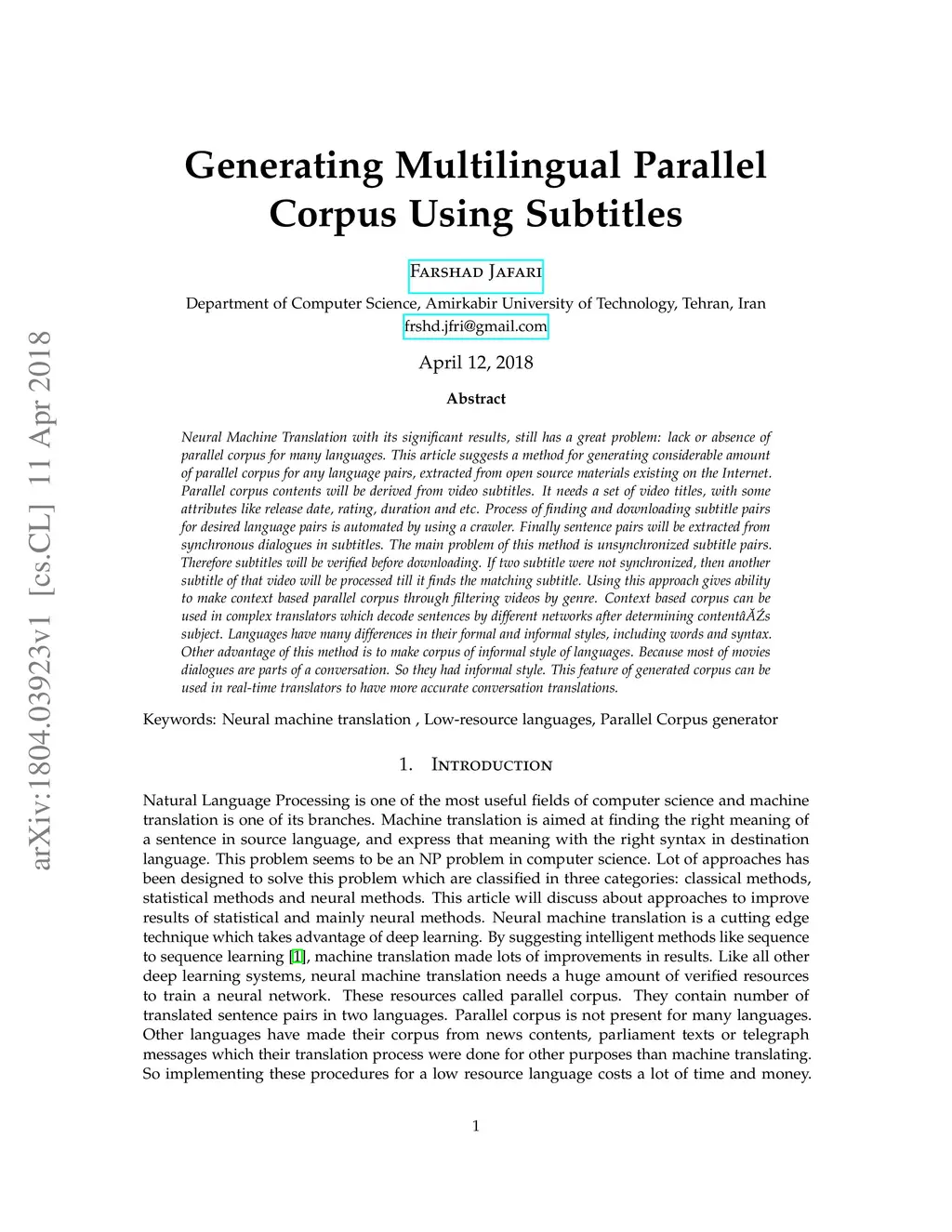 Neural Machine Translation with its significant results, still has a great problem: lack or absence of parallel corpus for many languages. This article suggests a method for generating considerable amount of parallel corpus for any language pairs, extracted from open source materials existing on the Internet. Parallel corpus contents will be derived from video subtitles. It needs a set of video titles, with some attributes like release date, rating, duration and etc. Process of finding and downloading subtitle pairs for desired language pairs is automated by using a crawler. Finally sentence pairs will be extracted from synchronous dialogues in subtitles. The main problem of this method is unsynchronized subtitle pairs. Therefore subtitles will be verified before downloading. If two subtitle were not synchronized, then another subtitle of that video will be processed till it finds the matching subtitle. Using this approach gives ability to make context based parallel corpus through filtering videos by genre. Context based corpus can be used in complex translators which decode sentences by different networks after determining contents subject. Languages have many differences in their formal and informal styles, including words and syntax. Other advantage of this method is to make corpus of informal style of languages. Because most of movies dialogues are parts of a conversation. So they had informal style. This feature of generated corpus can be used in real-time translators to have more accurate conversation translations.