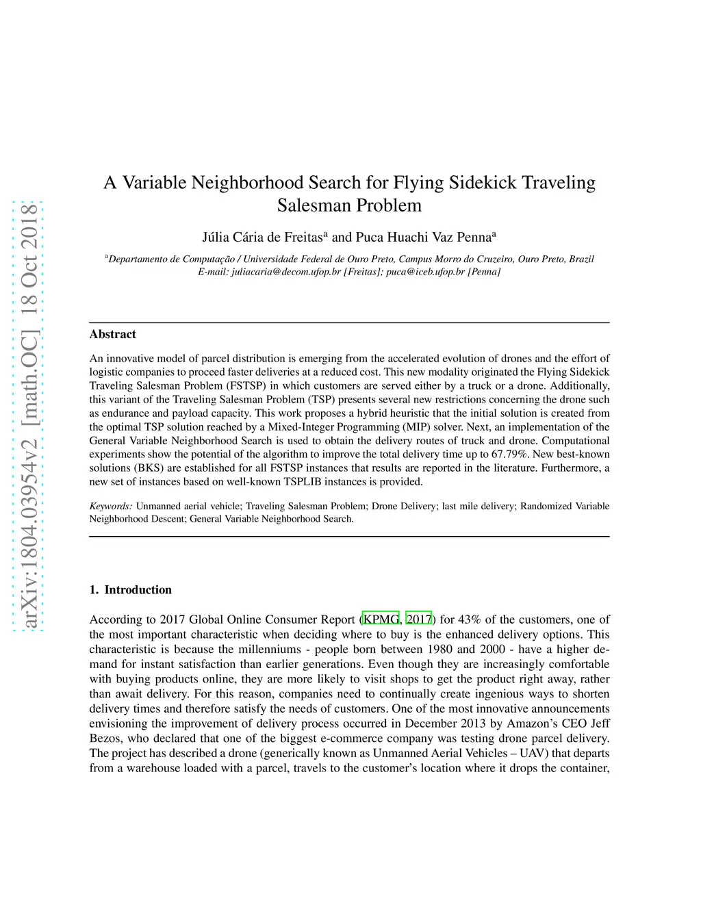 The efficiency and dynamism of Unmanned Aerial Vehicles (UAVs), or drones, present substantial application opportunities in several industries in the last years. Notably, the logistic companies gave close attention to these vehicles envisioning reduce delivery time and operational cost. A variant of the Traveling Salesman Problem (TSP) called Flying Sidekick Traveling Salesman Problem (FSTSP) was introduced involving drone-assisted parcel delivery. The drone is launched from the truck, proceeds to deliver parcels to a customer and then is recovered by the truck in a third location. While the drone travels through a trip, the truck delivers parcels to other customers as long as the drone has enough battery to hover waiting for the truck. This work proposes a hybrid heuristic that the initial solution is created from the optimal TSP solution reached by a TSP solver. Next, an implementation of the General Variable Neighborhood Search is used to obtain the delivery routes of truck and drone. Computational experiments show the potential of the algorithm to improve the delivery time significantly. Furthermore, we provide a new set of instances based on well-known TSPLIB instances.