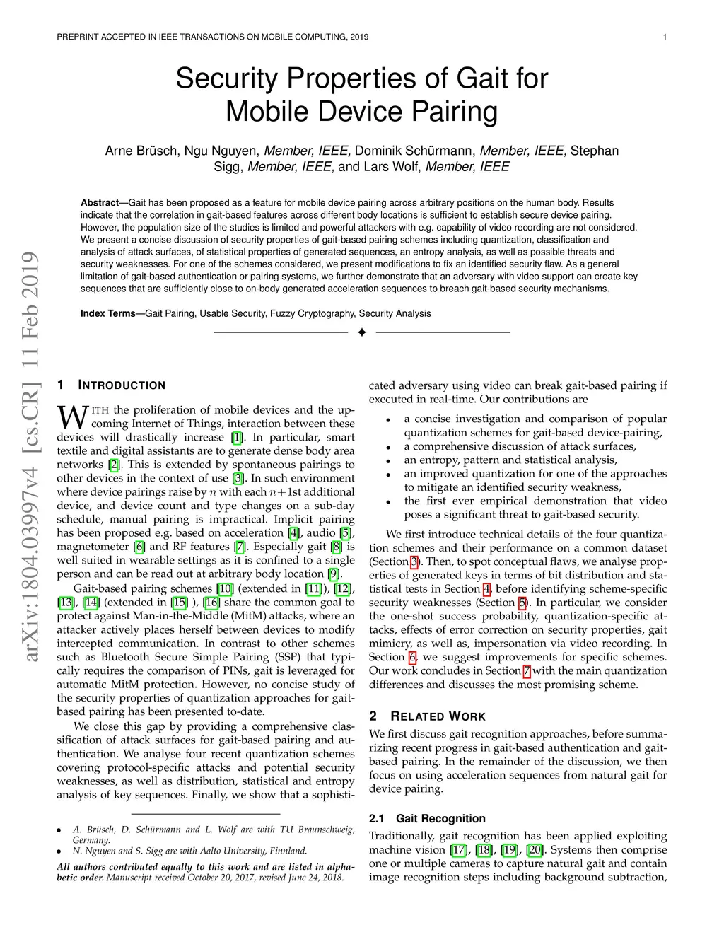 Gait has been proposed as a feature for mobile device pairing across arbitrary positions on the human body. Results indicate that the correlation in gait-based features across different body locations is sufficient to establish secure device pairing. However, the population size of the studies is limited and powerful attackers with e.g. capability of video recording are not considered. We present a concise discussion of security properties of gait-based pairing schemes including a discussion of popular quantization schemes, classification and analysis of attack surfaces, discussion of statistical properties of generated sequences, an entropy analysis, as well as possible threats and security weaknesses of gait-based pairing systems. For one of the schemes considered, we present modifications to fix an identified security flaw. As a general limitation of gait-based authentication or pairing systems, we further demonstrate that an adversary with video support can create key sequences that are sufficiently close to on-body generated acceleration sequences to breach gait-based security mechanisms.